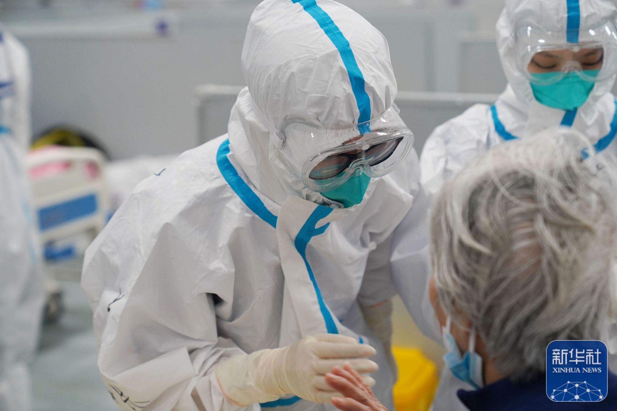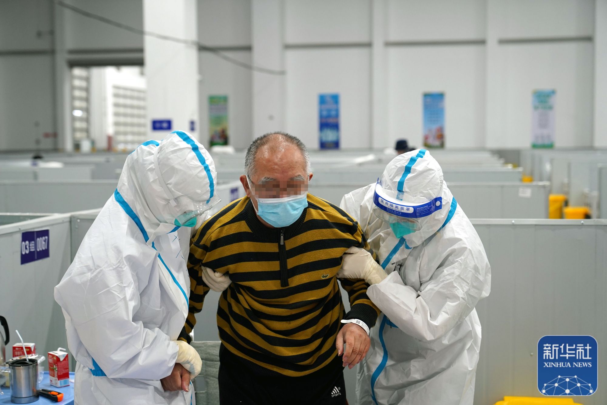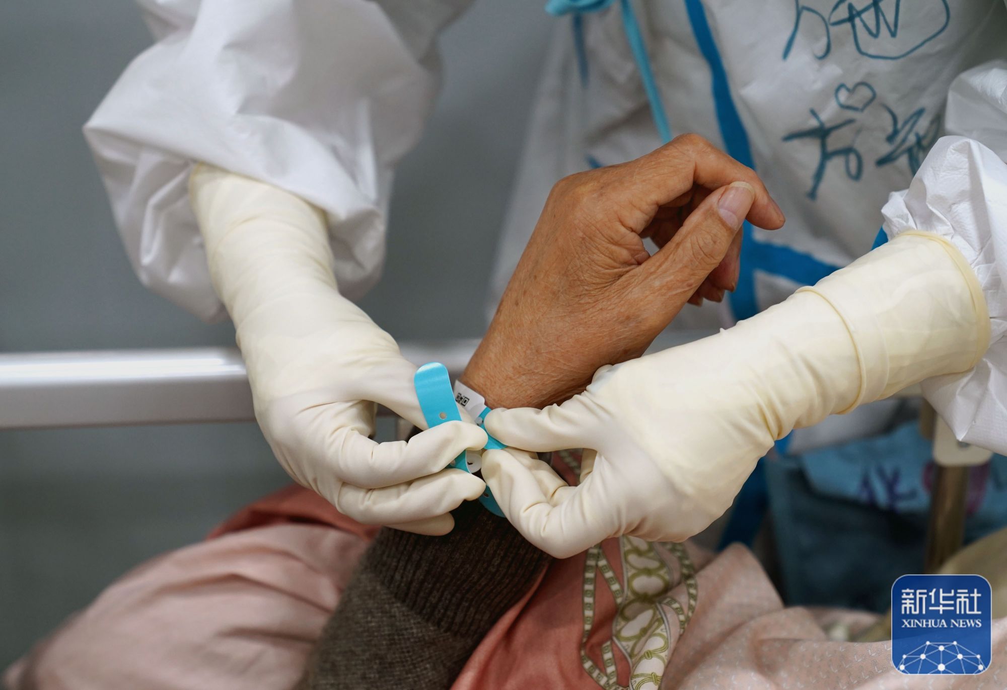 4月23日,上海临港方舱医院的医护人员帮助老年患者佩戴腕带。