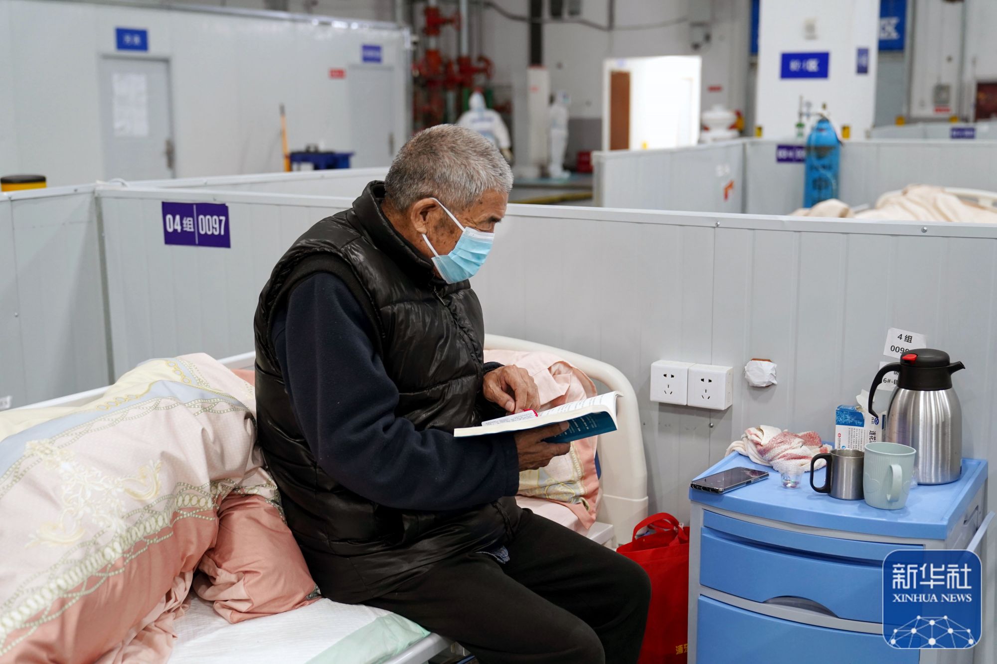 4月23日,在上海临港方舱医院,老年患者坐在床边看书。