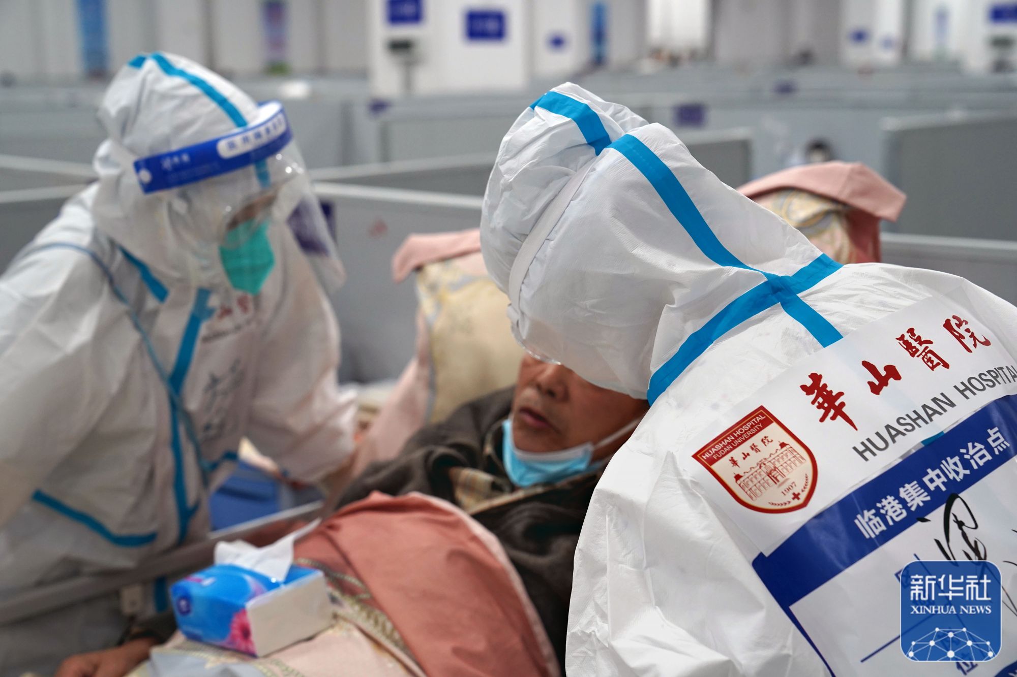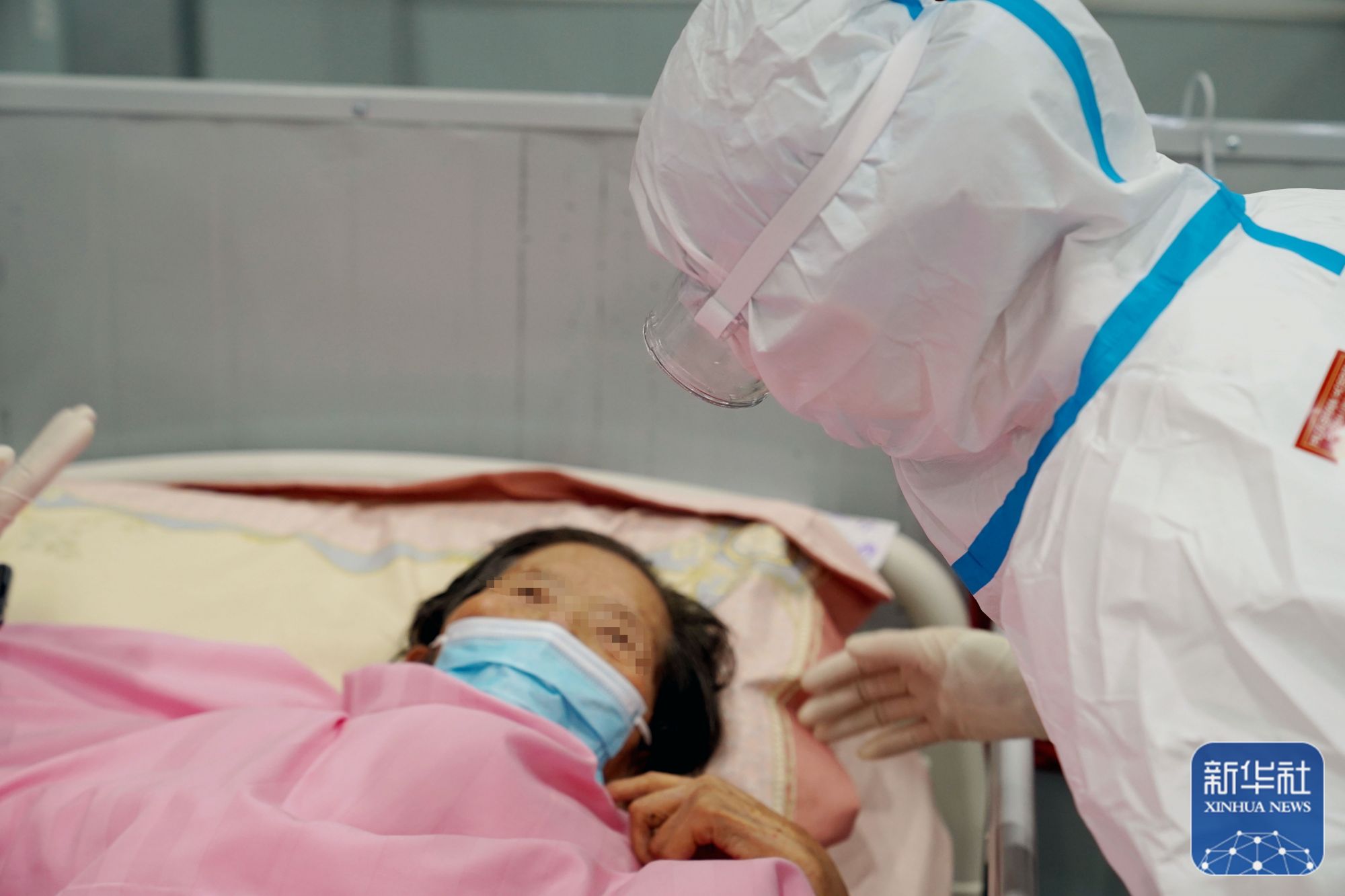 4月23日,上海临港方舱医院的医护人员与老年患者交流。