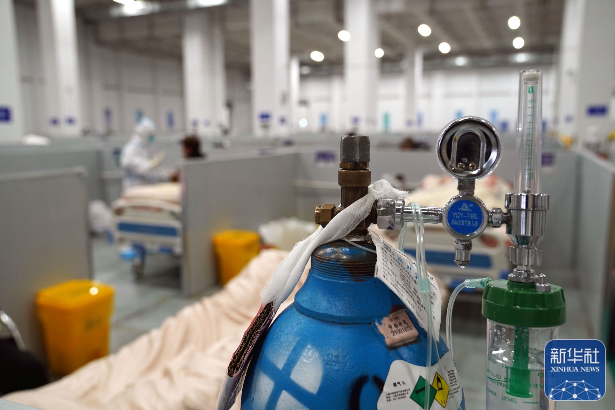 4月23日在上海临港方舱医院拍摄的升级改造床位配备的氧气瓶。