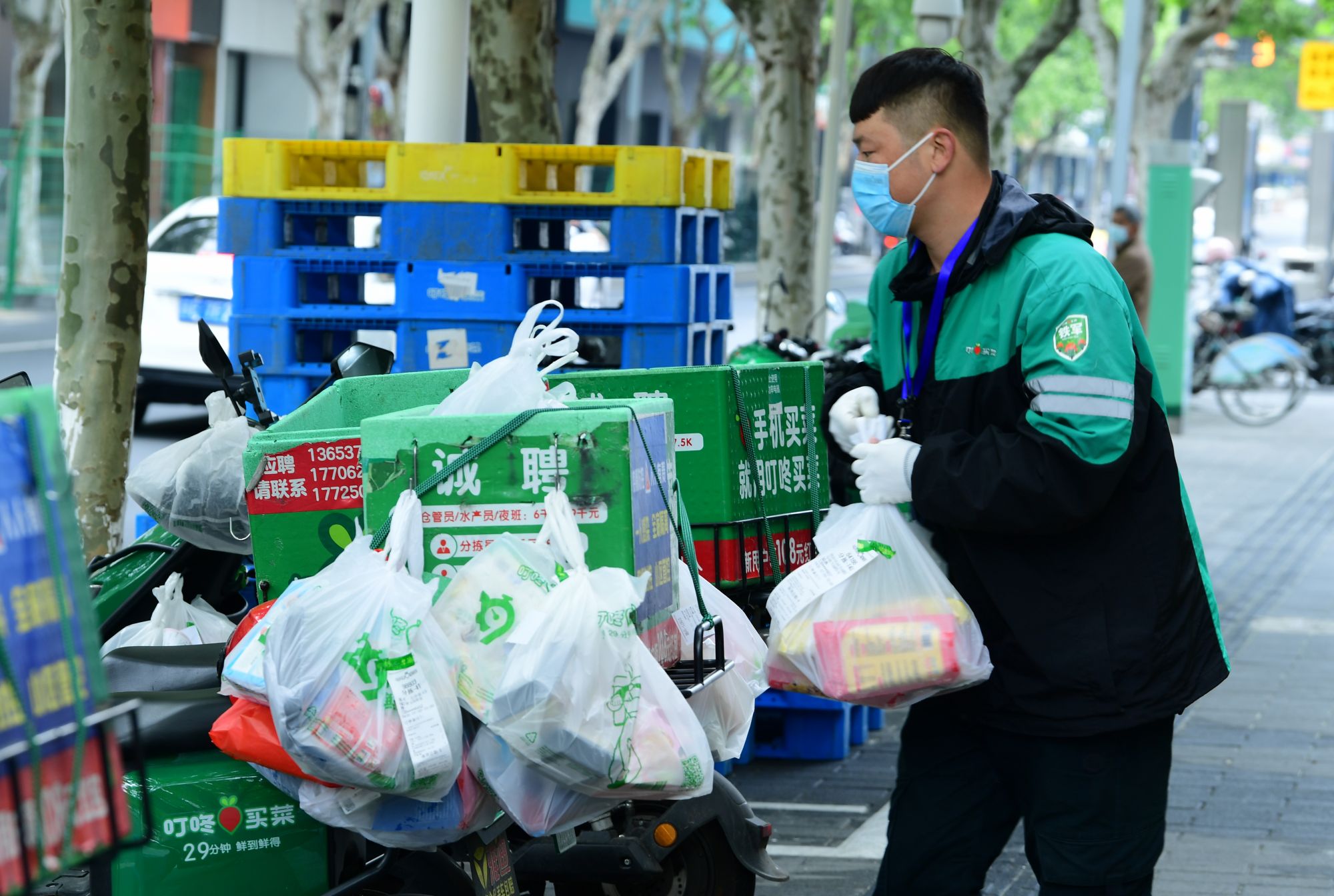 ↑4月30日,在江苏省太仓市一家生鲜电商配送点,配送小哥在整理当天准备配送的生鲜订单。新华社发(计海新 摄)