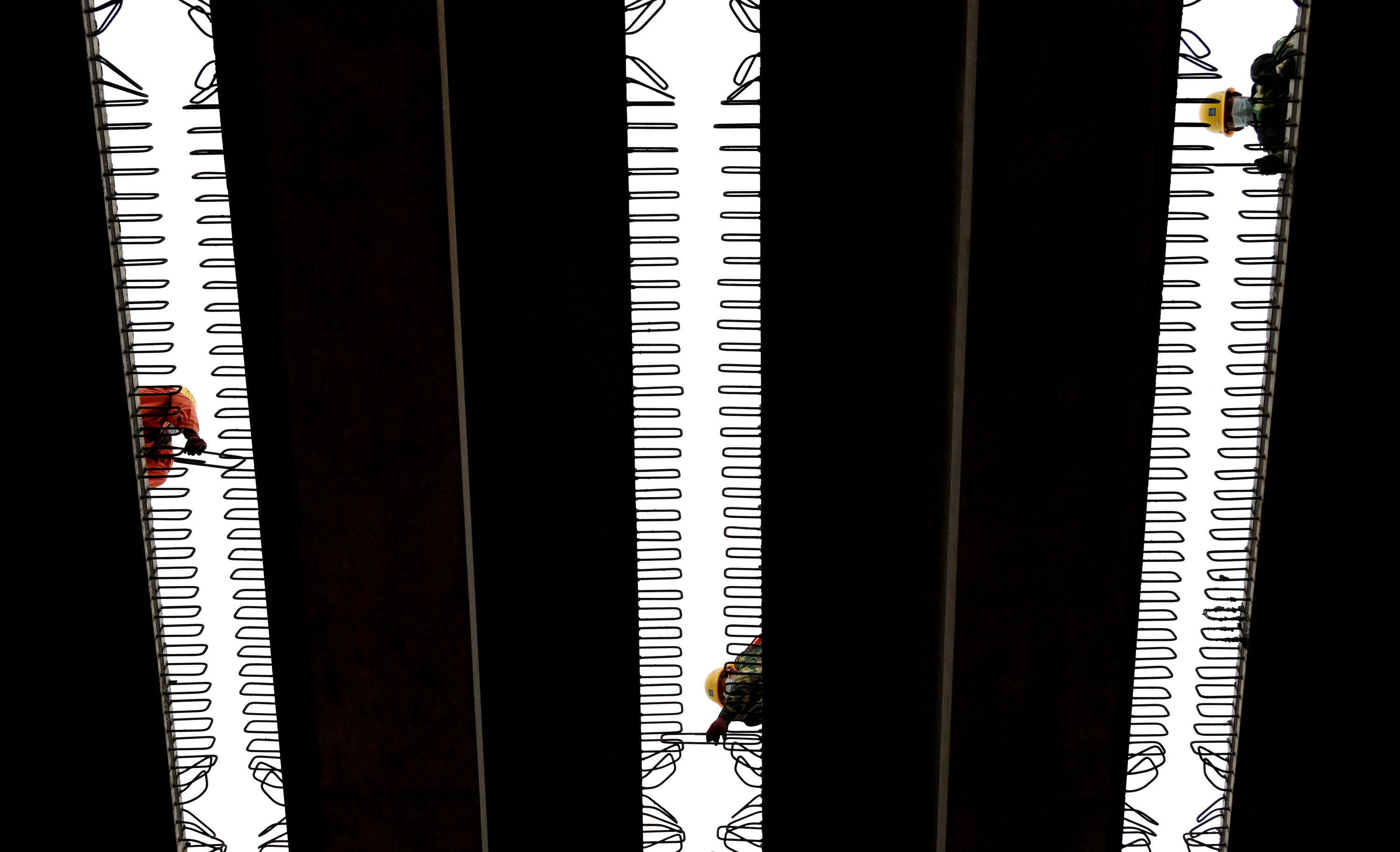 ↑4月30日,在浙江省杭温铁路台州市仙居高架站项目现场,中铁上海工程局建设者在抓紧施工(无人机照片)。新华社发(王华斌 摄)
