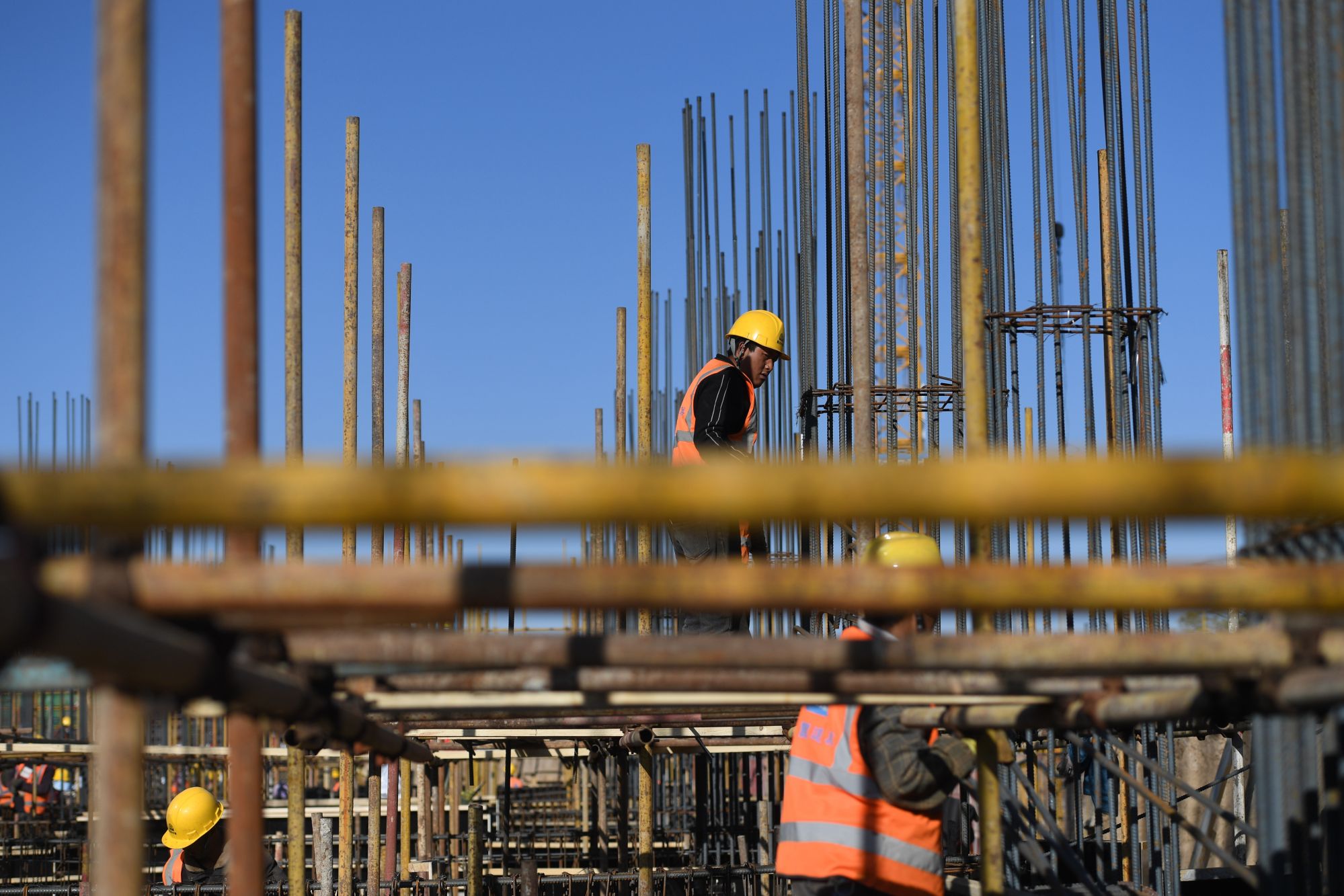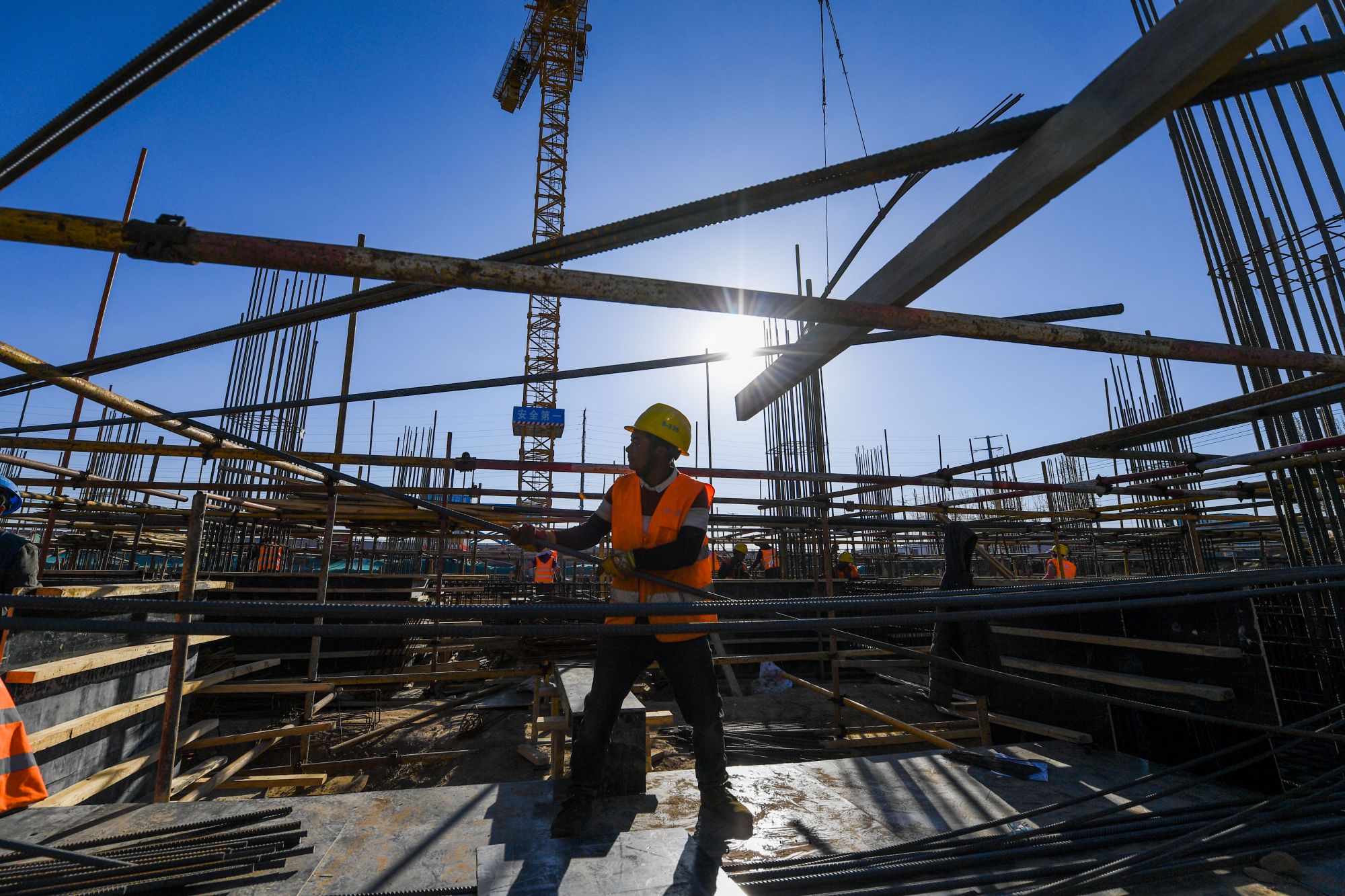 ↑4月30日,工人在内蒙古和林格尔新区中国银行总行金融科技中心项目工地施工。新华社记者 刘磊 摄