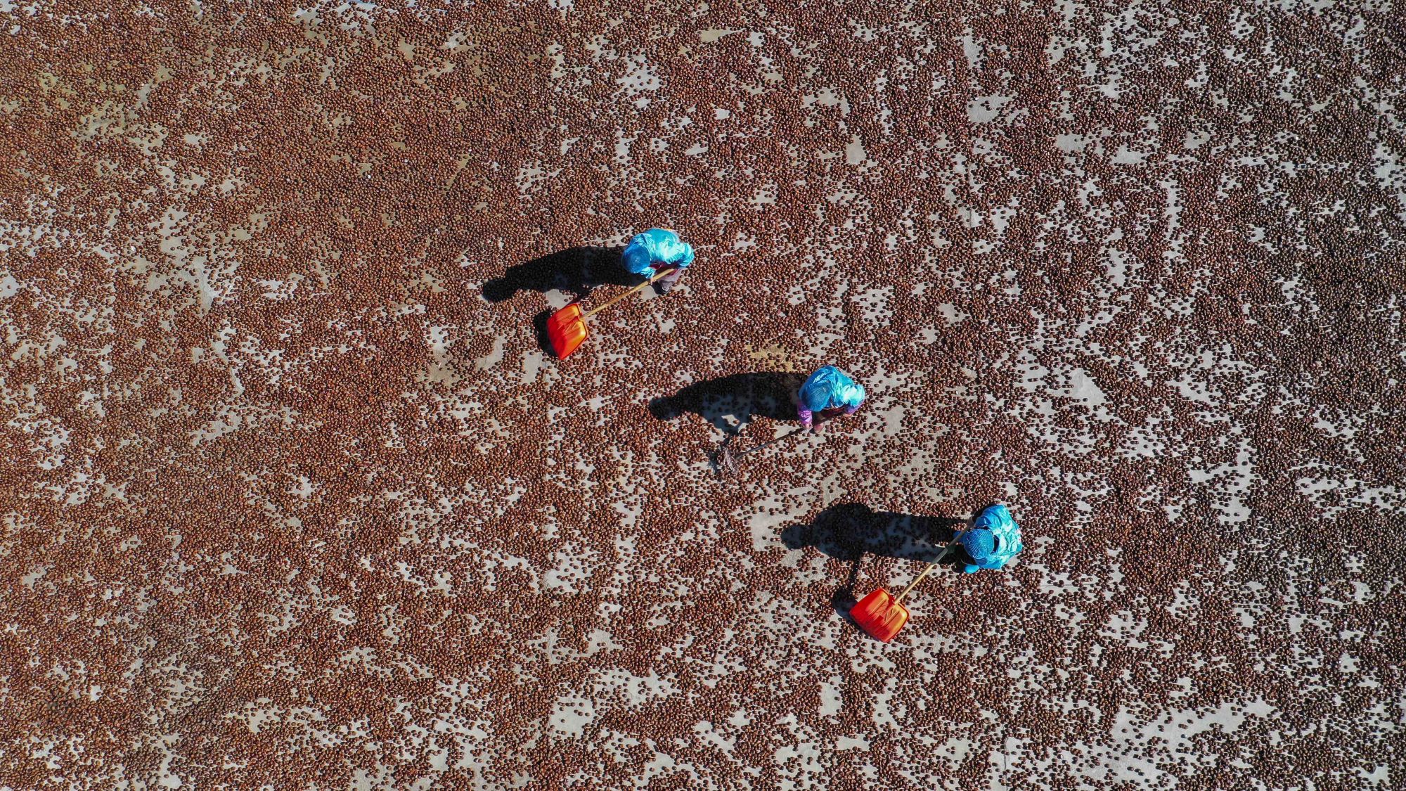↑4月30日,工人在河北唐山遵化市侯家寨乡一家栗子加工厂晾晒栗子(无人机照片)。新华社发(刘满仓 摄)