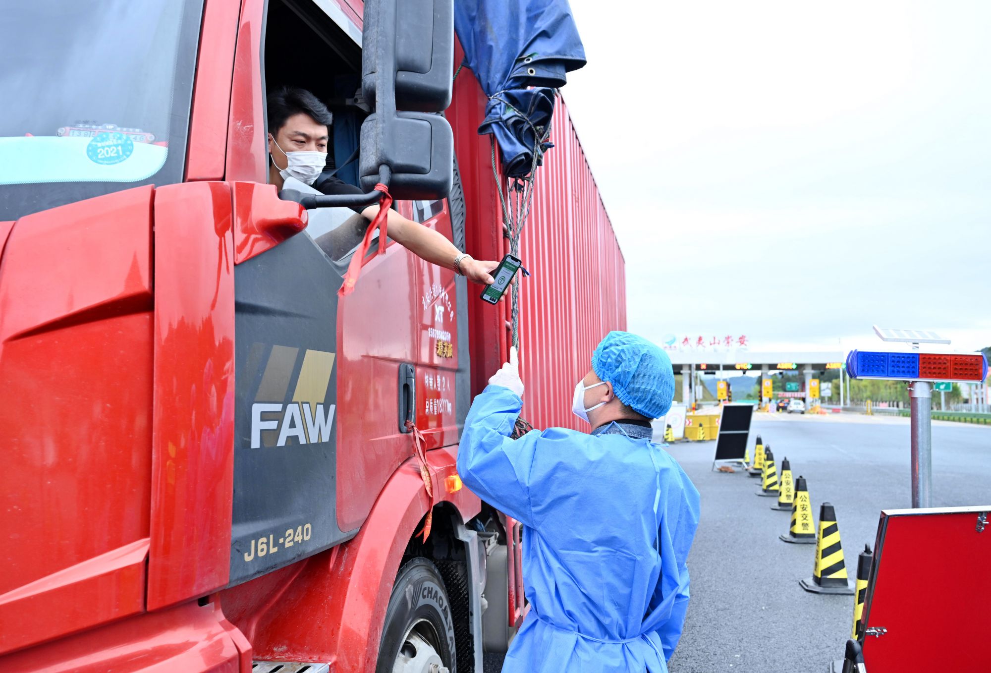 ↑4月30日,工作人员在福建武夷山崇安高速口检查货车司机健康码和行程记录。新华社发(黄杰敏 摄)
