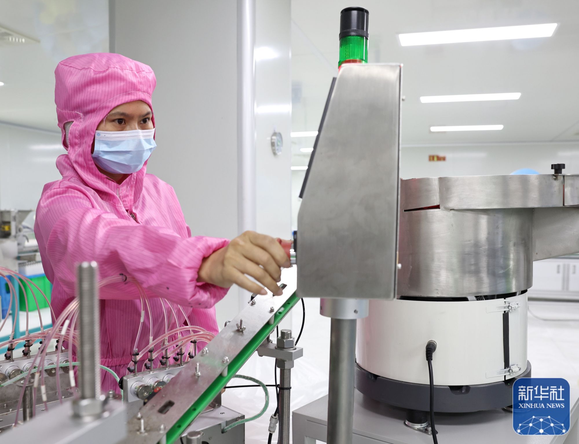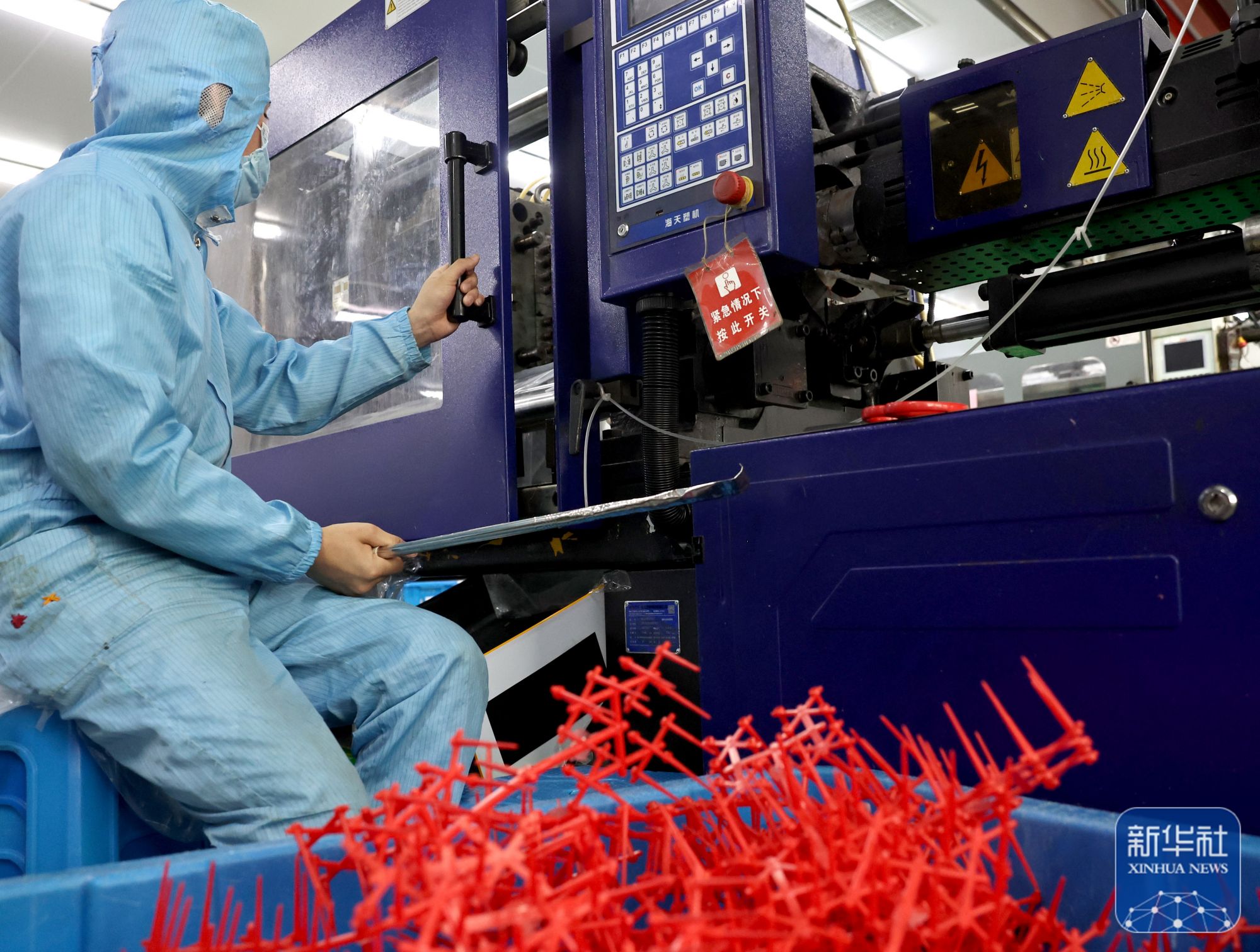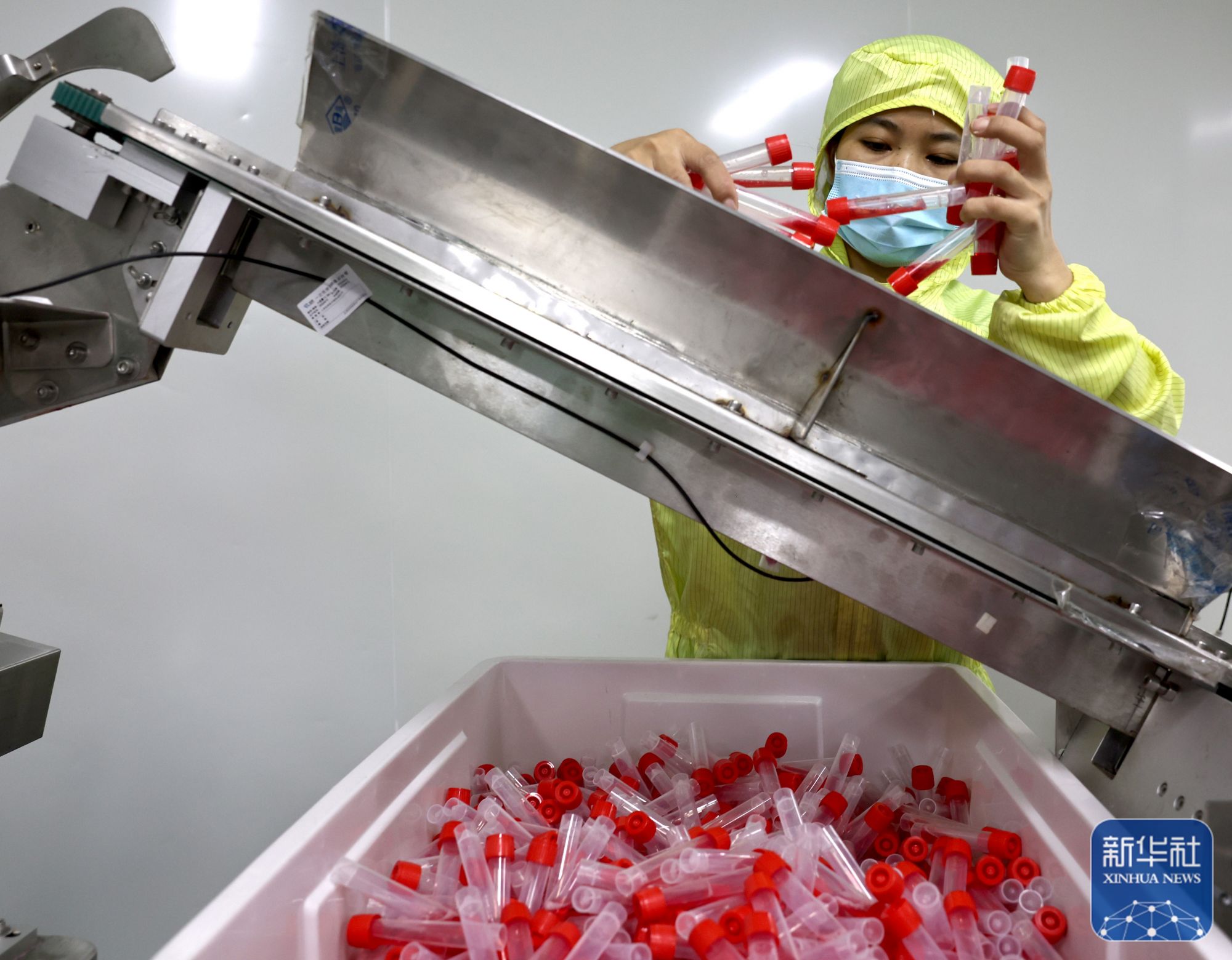 5月1日,工人在上海市金山区枫泾镇上海宝舜医疗器械有限公司核酸试管生产线上工作。该公司通过加装生产线、闭环生产等措施,开足马力生产核酸试管、口罩等防疫物资。