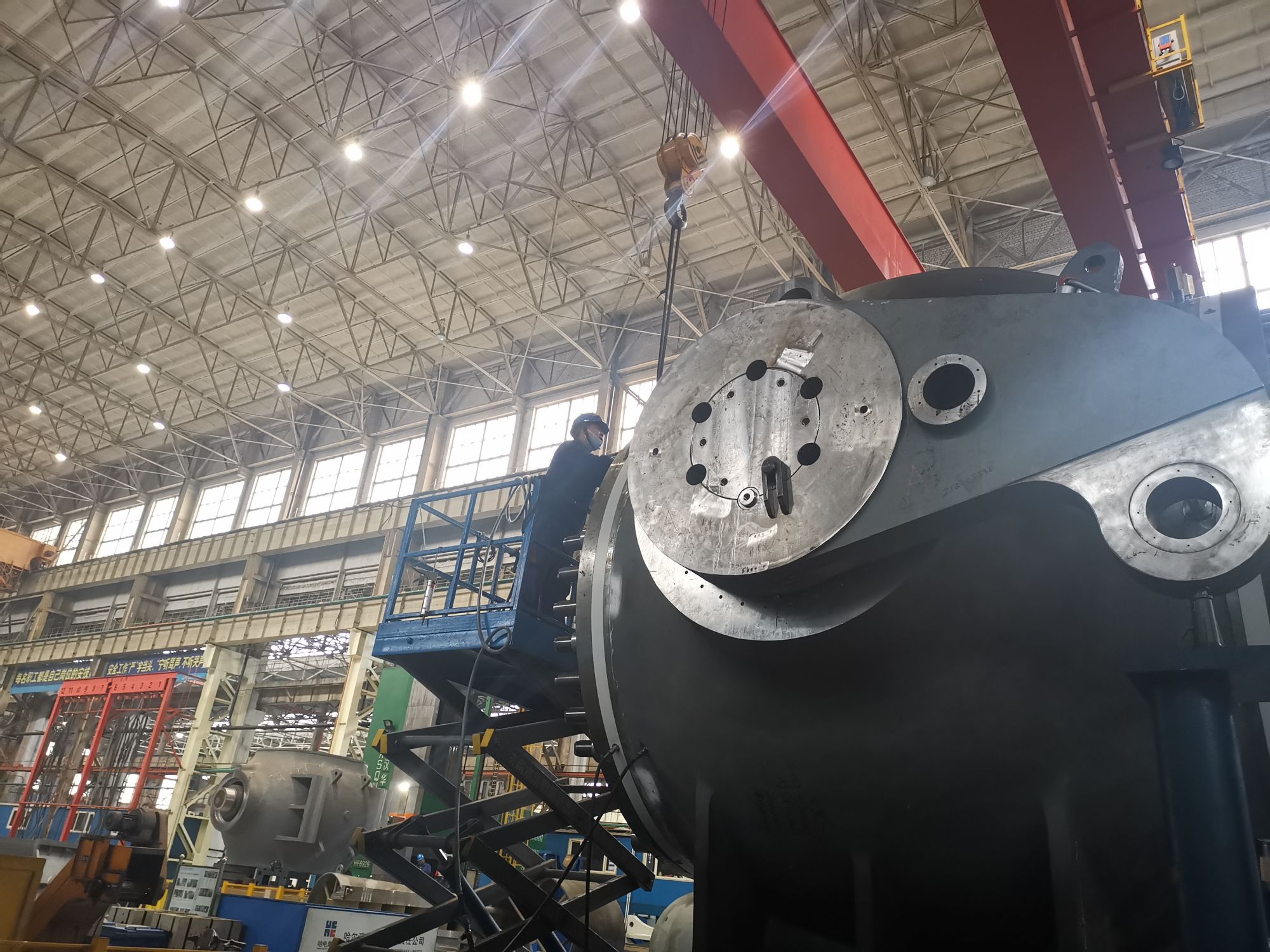 哈电集团哈尔滨电机厂有限责任公司水电分厂,工人在球阀上作业。新华社记者强勇 摄