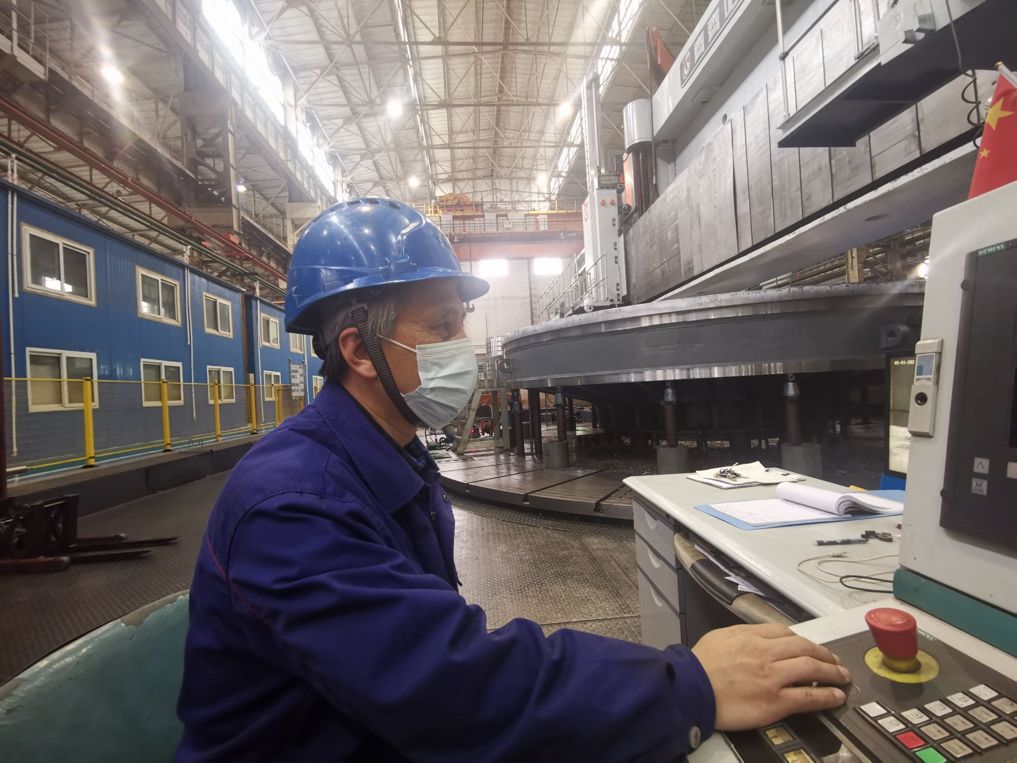 在水电分厂大件工段,记者见到了52岁的车工班班长胡宇。他戴着口罩,在经过消杀处理的工位上熟练操控着10米立车,对重达几十吨的半成品件进行切削、挖孔和塑形。