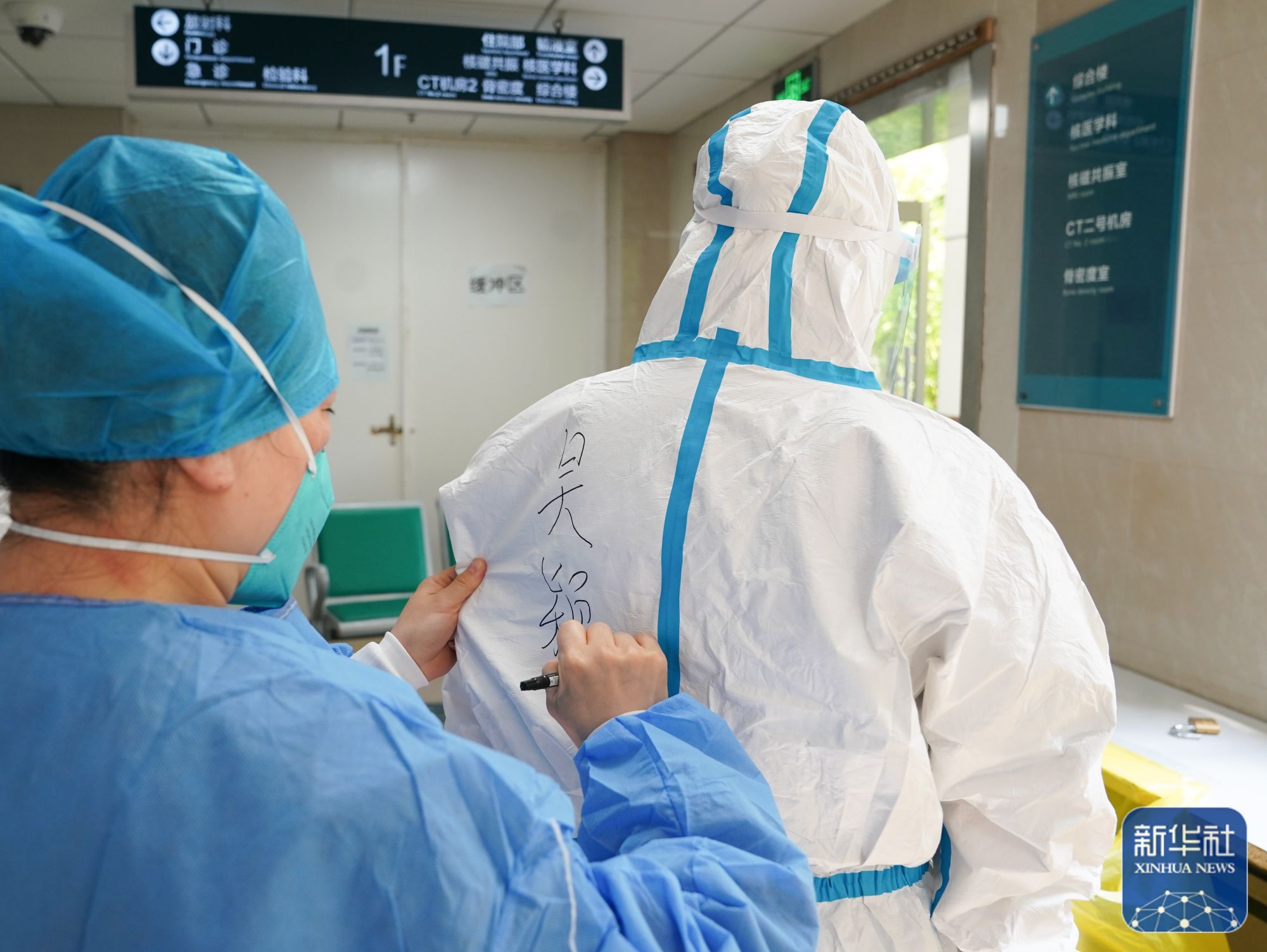 在上海市普陀区利群医院,同事帮吴颖在防护服上写名字(4月30日摄)。