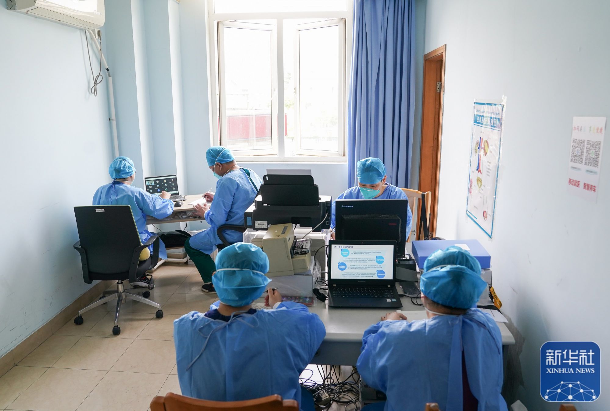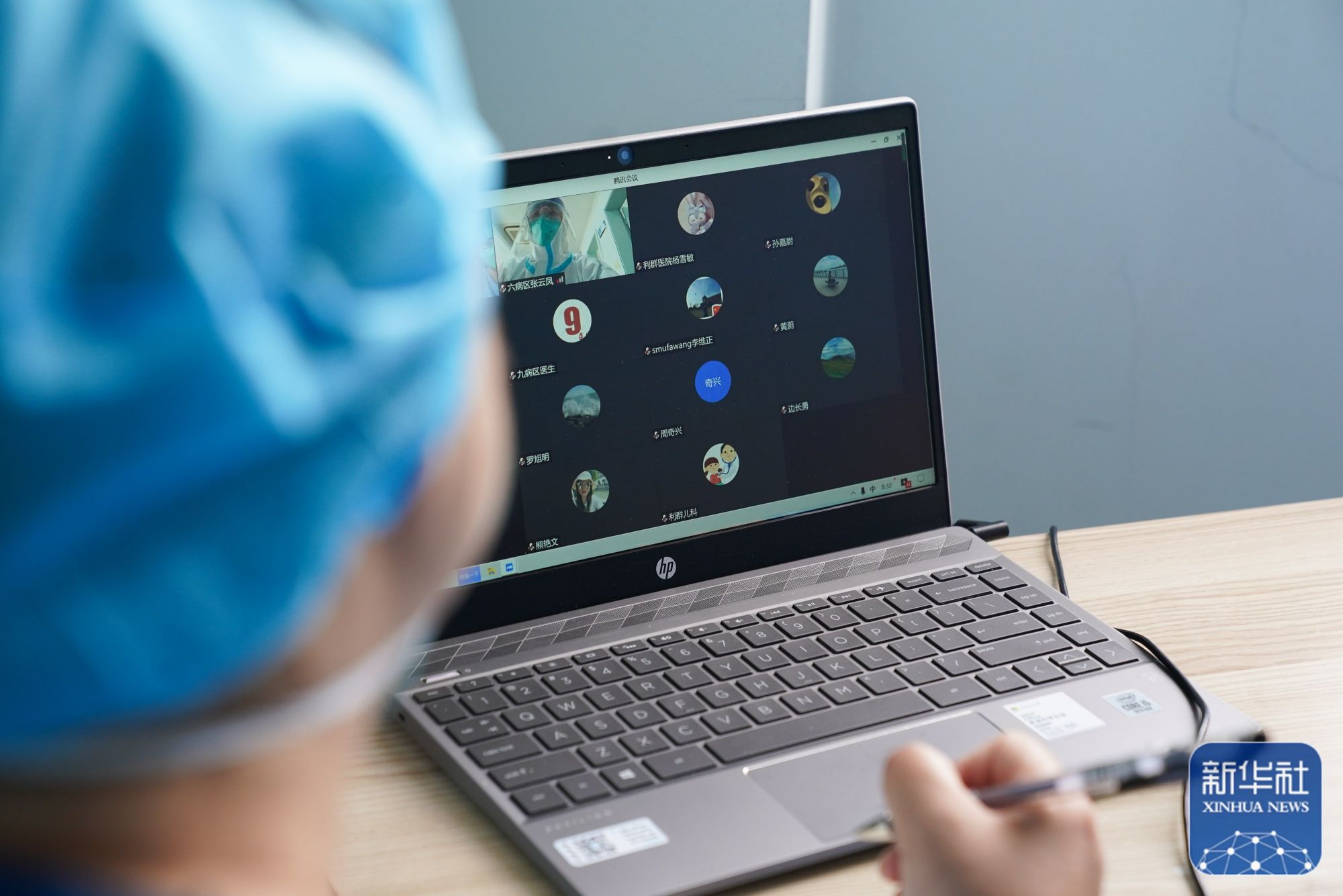 在上海市普陀区利群医院,吴颖在办公室开线上会议(4月30日摄)。