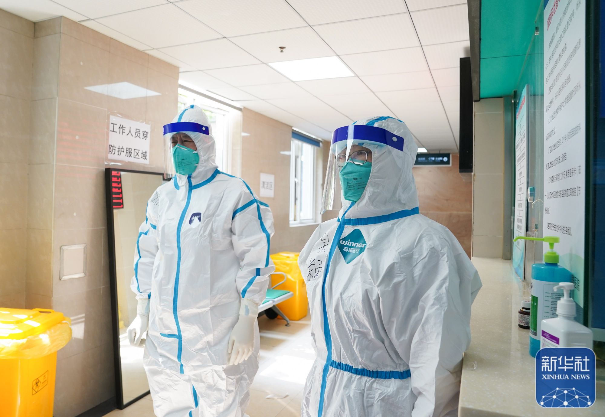 在上海市普陀区利群医院,吴颖(右)准备进入隔离病房(4月30日摄)。