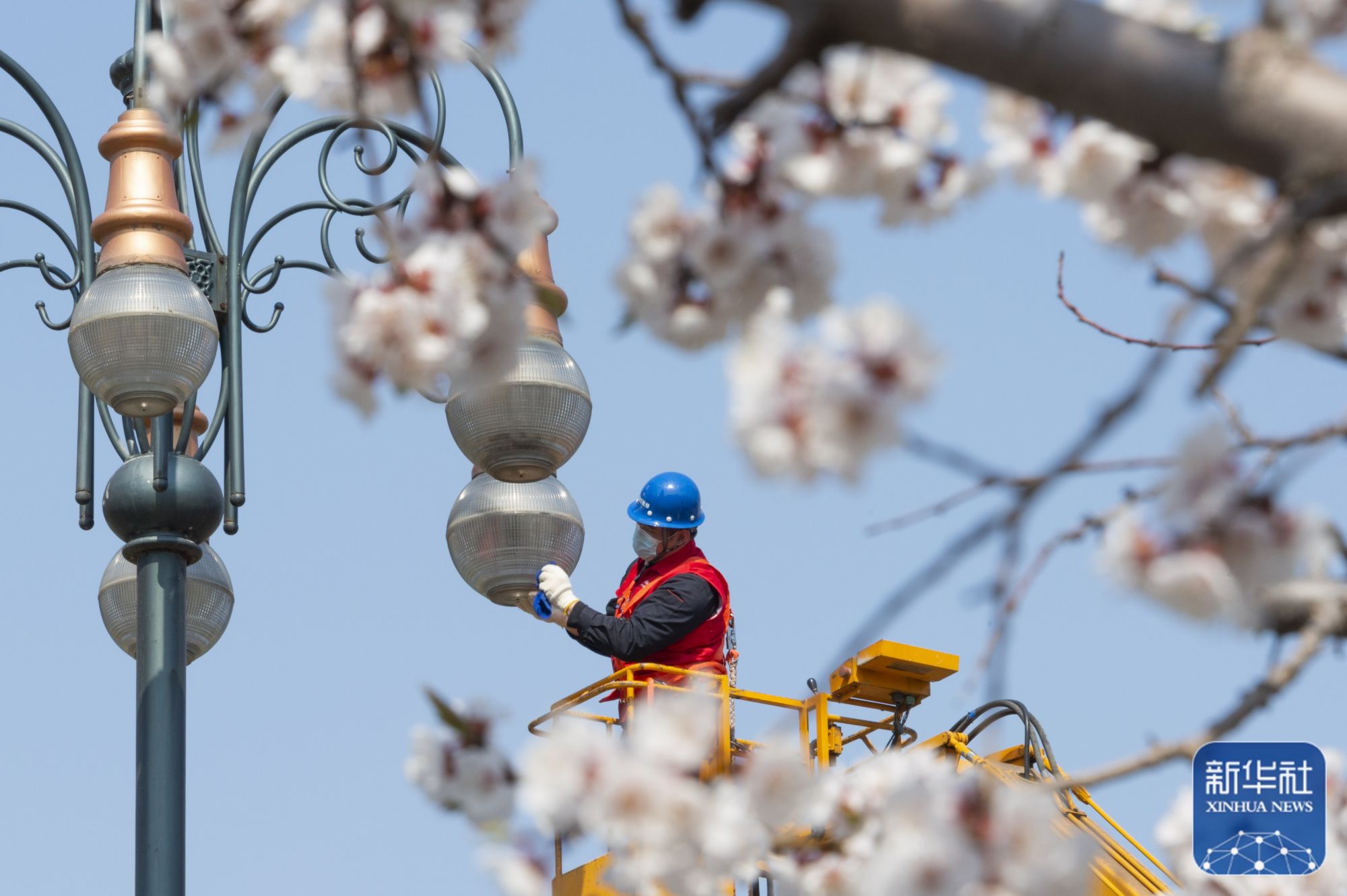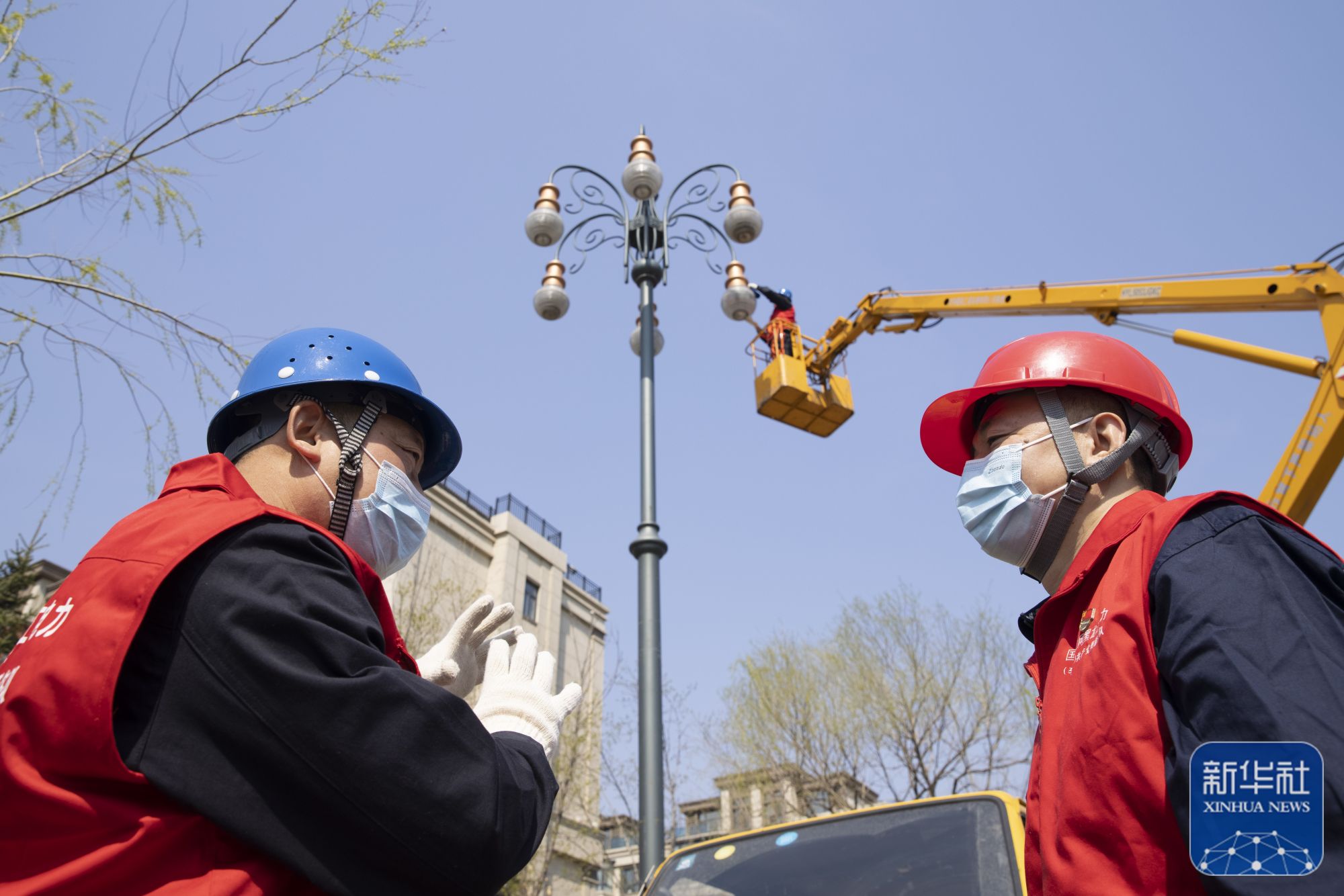 4月29日,在哈尔滨市松北区,国家电网黑龙江电力(李庆长)共产党员服务队队员在检修路灯。新华社记者 张涛 摄