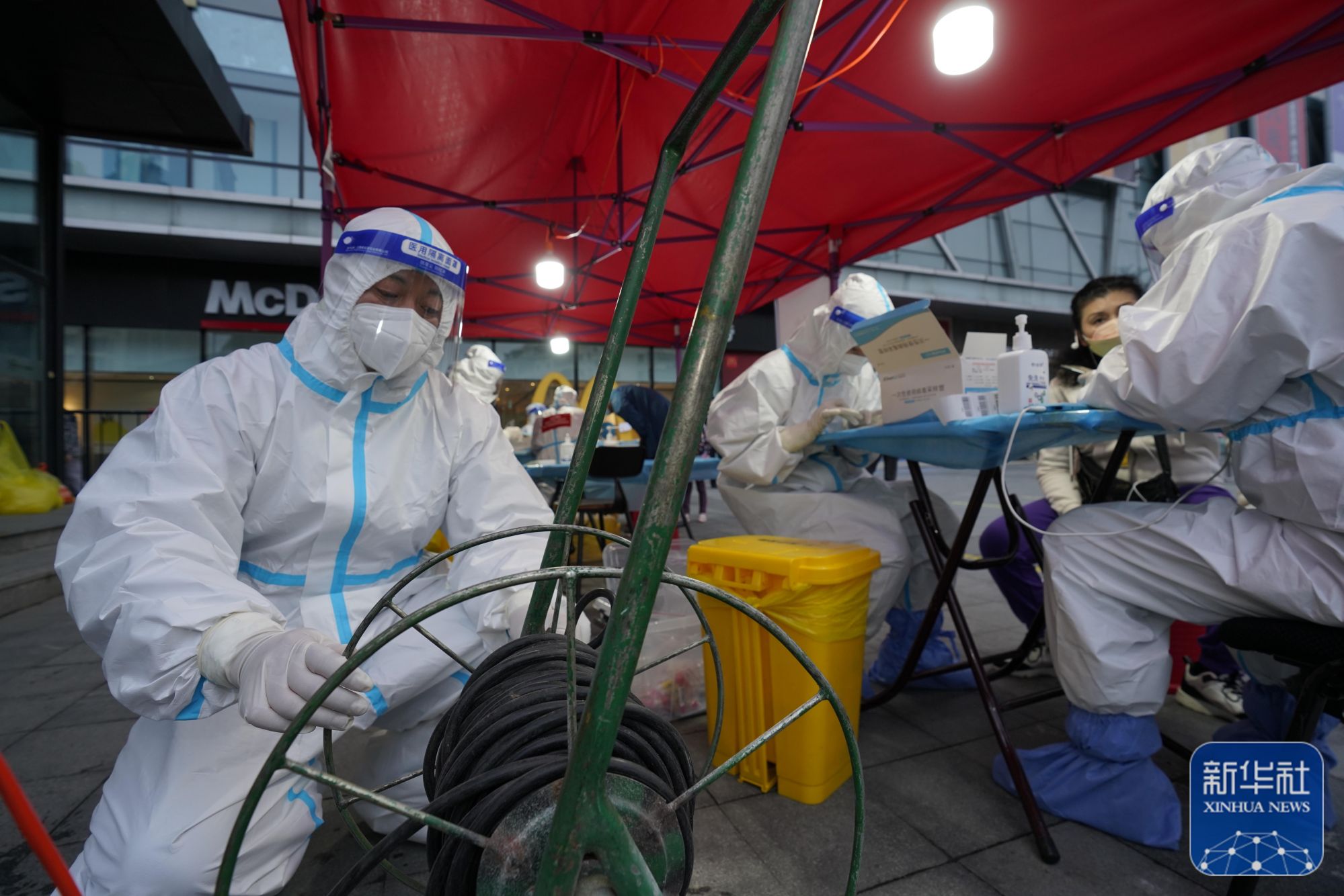 2021年9月26日,在哈尔滨市道里区,梅宏刚(左一)帮助一社区核酸采样点架设临时照明电源。新华社发(受访者供图)