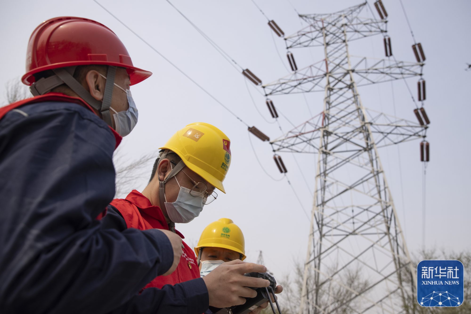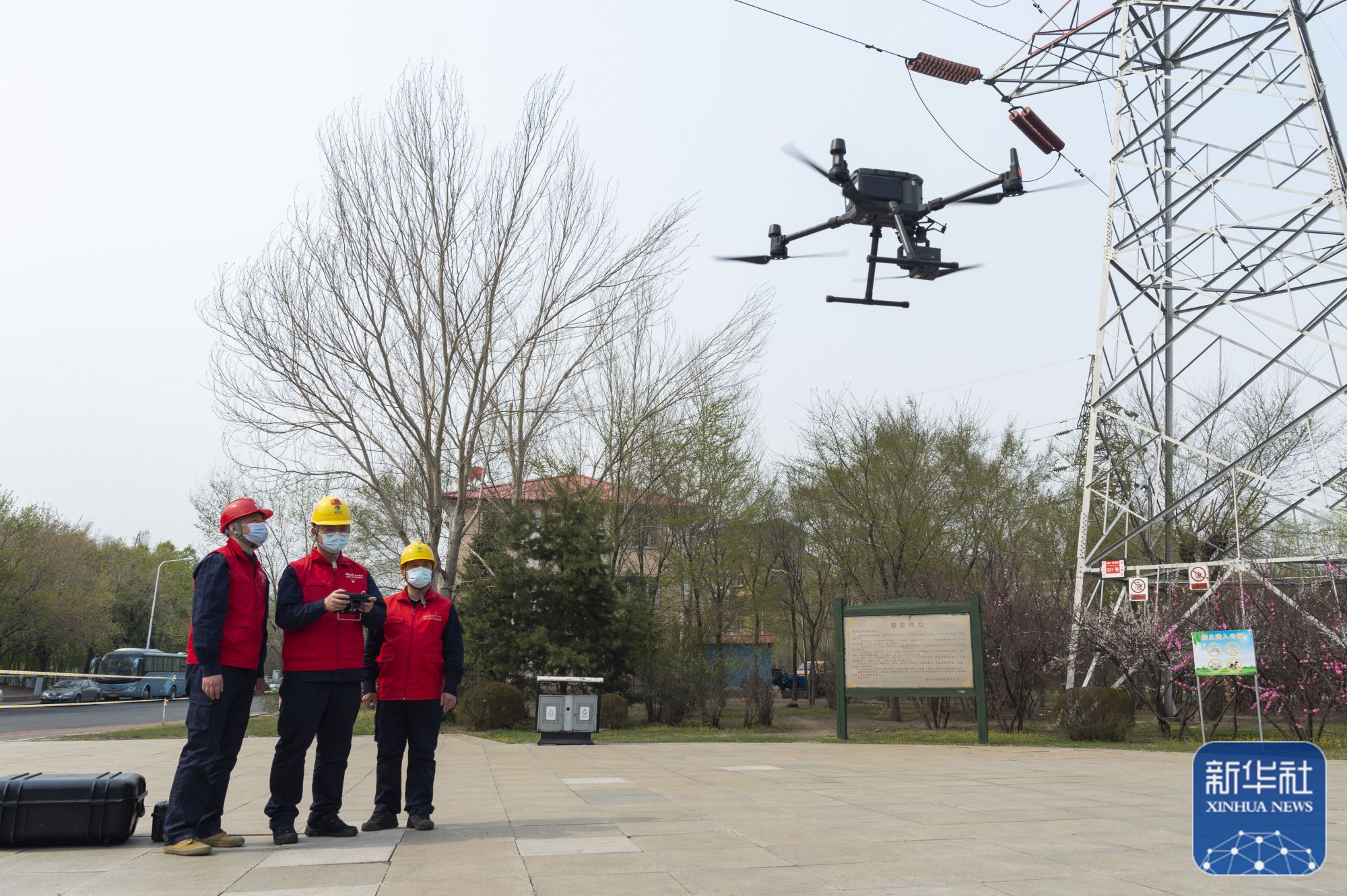4月29日,梅宏刚(左一)与同事一起利用无人机对供电设备进行特殊巡检。新华社记者 张涛 摄
