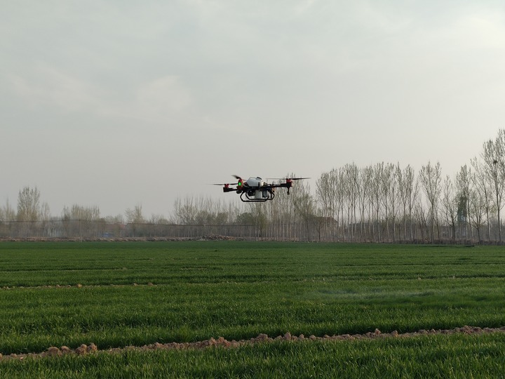 在山东省济南市济阳区的一片农田里,绿油油的小麦随风轻摆。济阳区回河街道张高村蓄松家庭农场负责人高丕全带着2个飞手正忙碌着。不一会儿,伴随着一阵“嗡嗡”声,无人机在空中洒下一片薄雾。