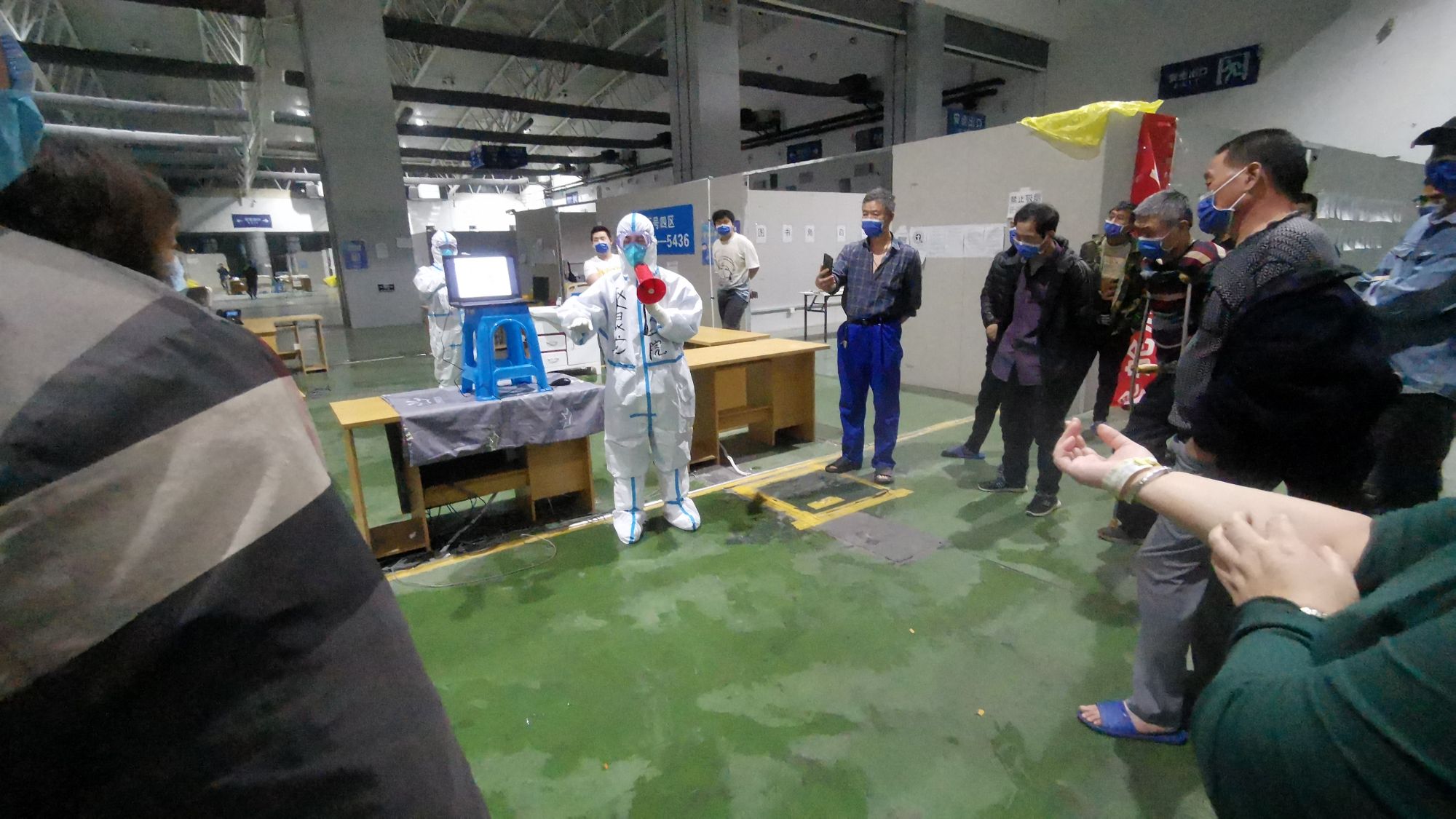 在长春国际会展中心方舱医院,吉林大学第二医院的医生正在为患者进行科普宣讲。(受访者供图)