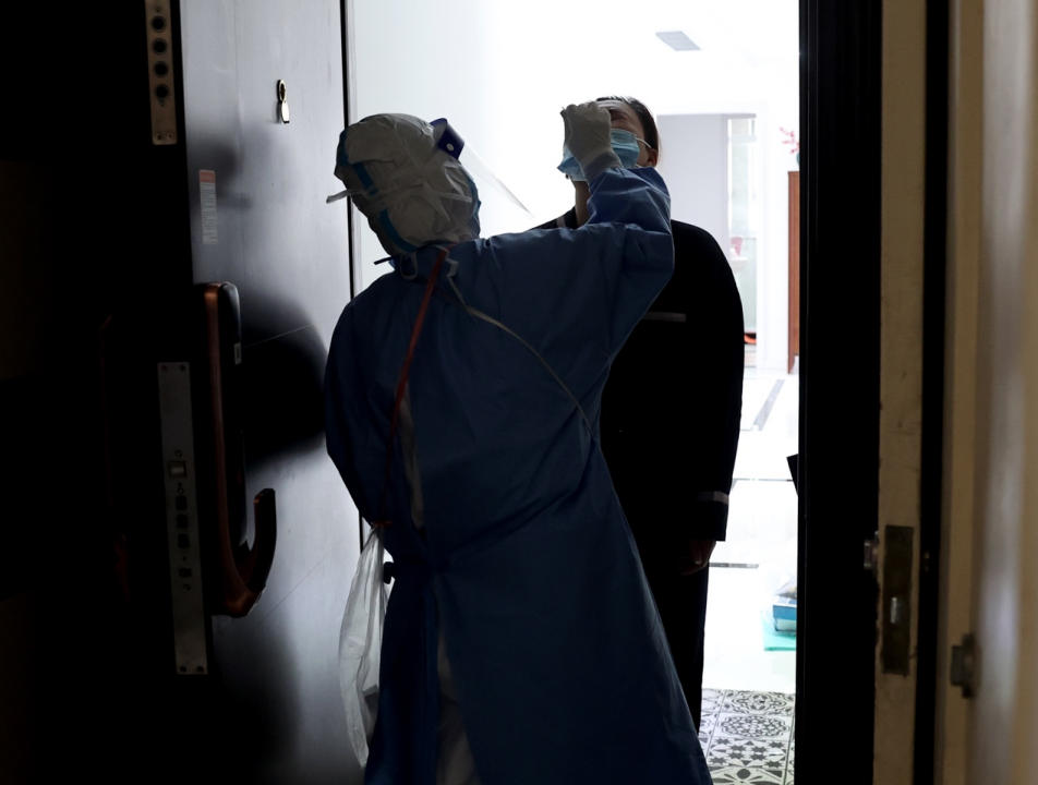 ↑4月28日,王瑛(前)在一小区居民楼进行核酸采样。