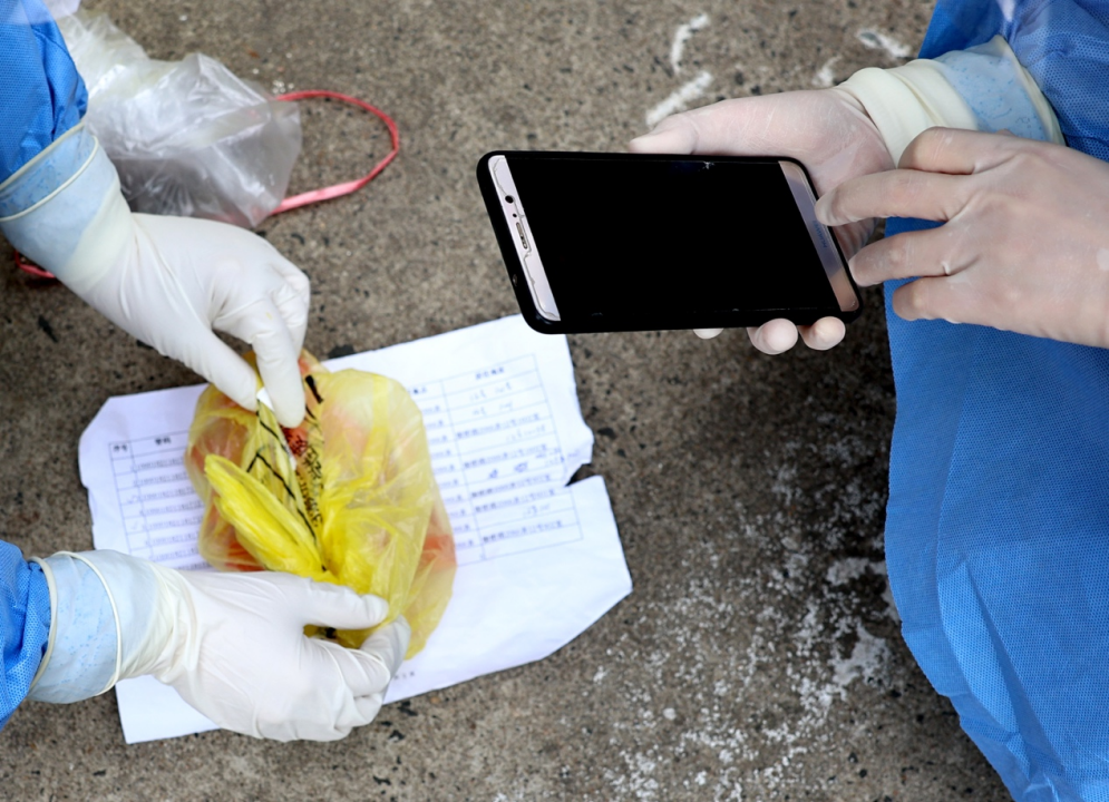 ↑4月28日,王瑛(右)和小陈在一小区居民楼外对样管进行扫码。