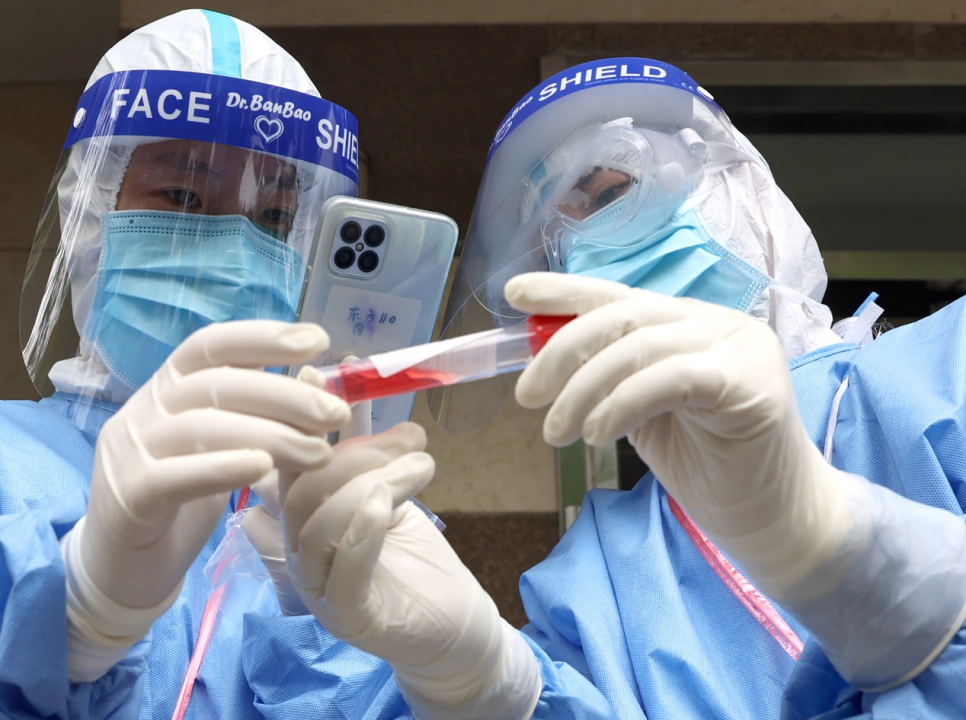↑4月28日,王瑛(左)和小陈完成核酸采样后进行核对工作。