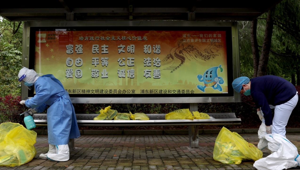 ↑4月28日,王瑛(右)和小陈在完成所有工作后在远离小区大门的一个公交站脱卸防护装备和对现场环境进行消杀。