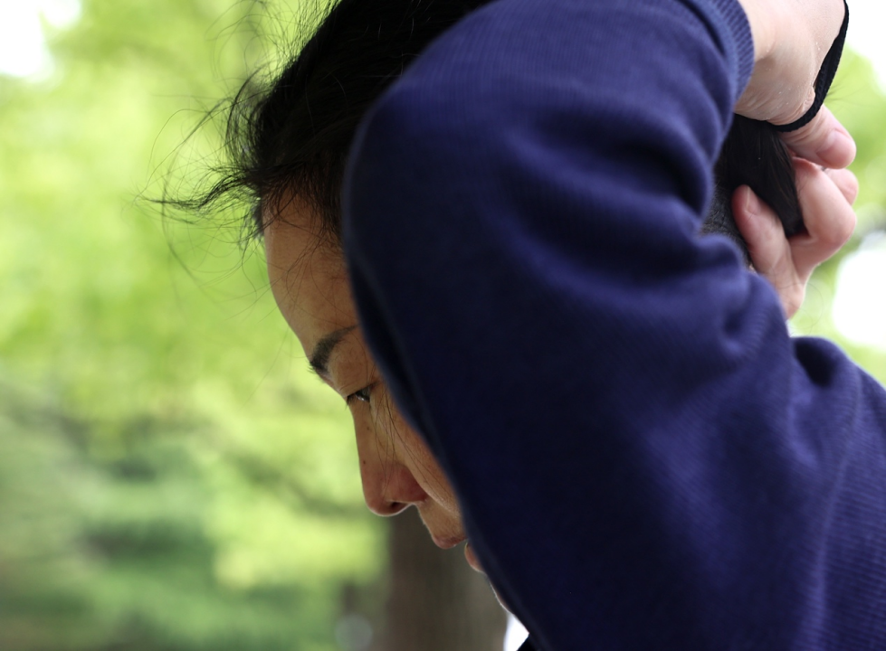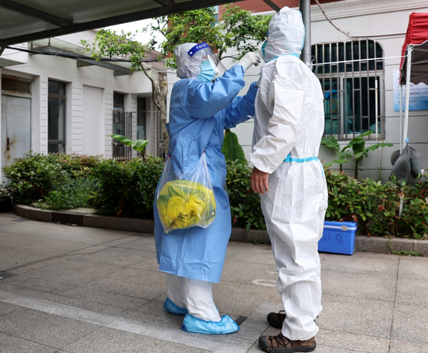 ↑4月28日,王瑛完成所有采样工作后,脱卸防护服,准备更换新口罩。