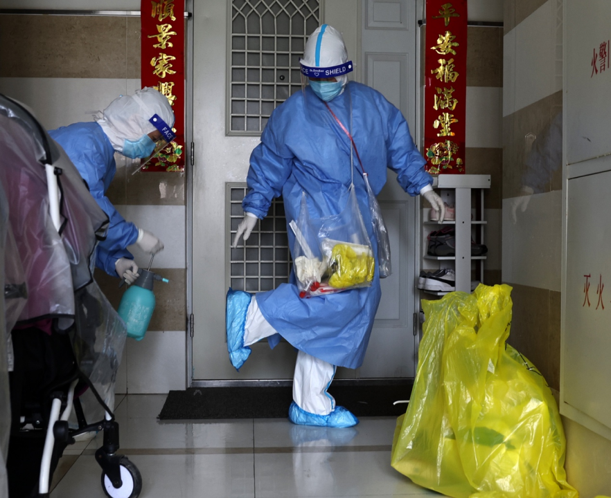 ↑4月28日,从一户人家采样完毕之后,小陈(左)进行消杀处理。