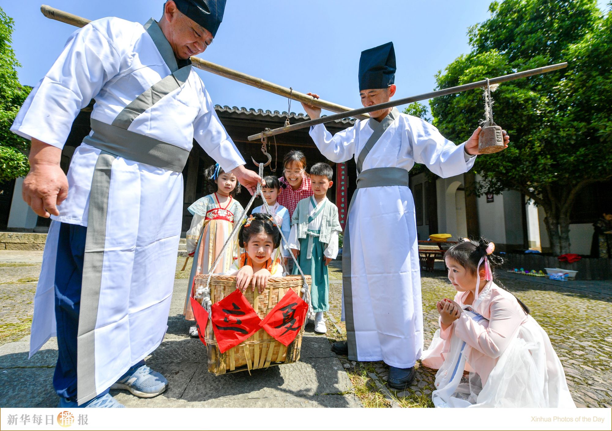5月5日,浙江省湖州市长兴县白溪居委会朱家祠堂,该县开发区实验幼儿园的孩子在体验称重习俗。当日是二十四节气中的立夏,各地群众开展多彩民俗活动迎立夏。