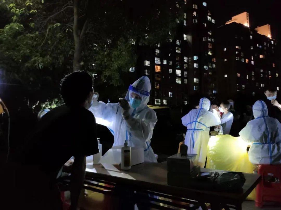 5月6日夜间,采样队员王林林在松江区新桥镇明中苑小区工作。