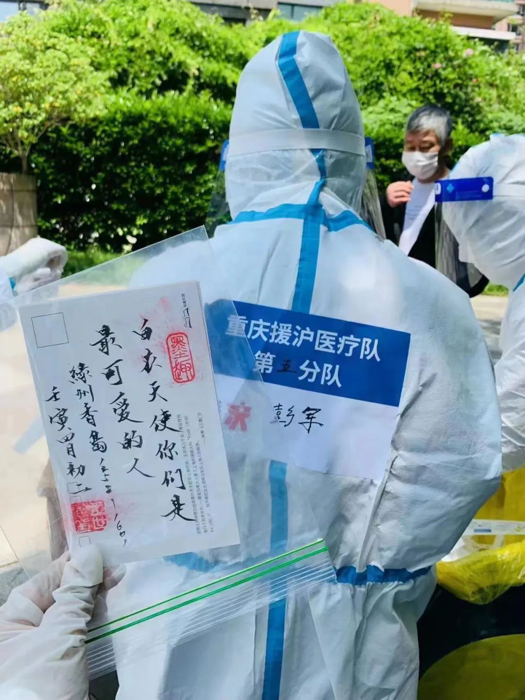 5月2日,采样分队彭军在松江区九亭镇绿洲香岛小区进行核酸采样,一名小女孩主动送来明信片,背面有手写的“白衣天使你们是最可爱的人”。