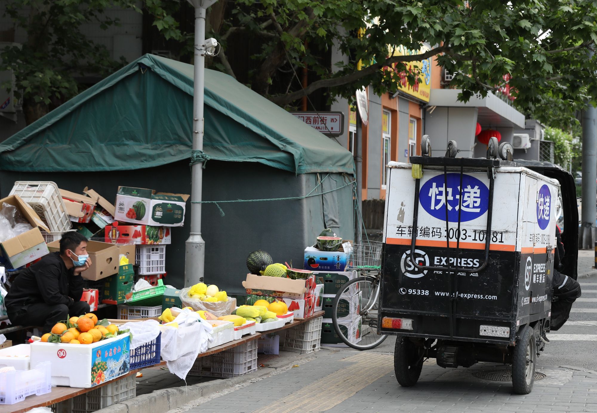5月14日,在北京西城区宣武门附近,一辆快递车经过一处水果摊。