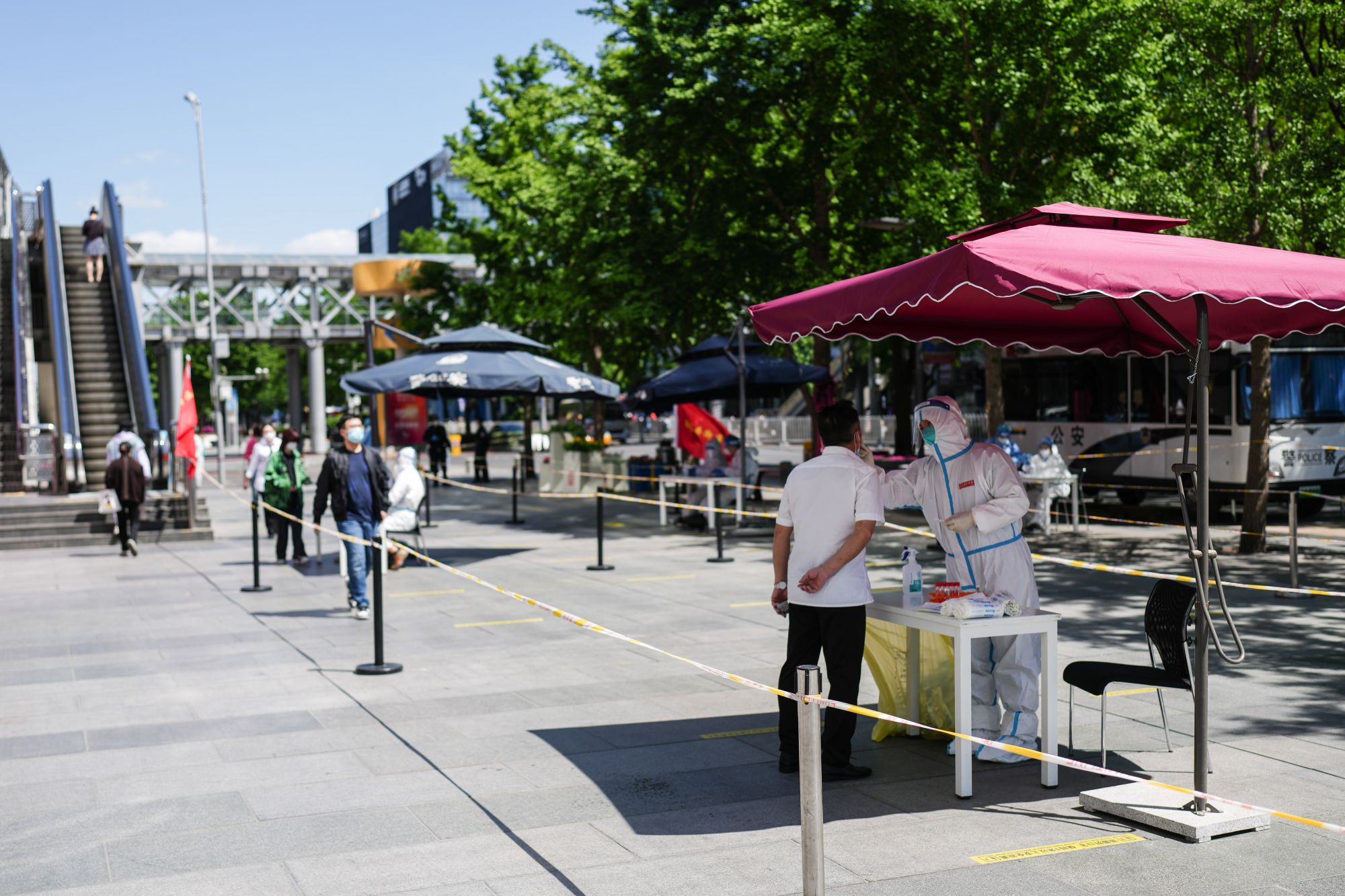 5月14日,在北京西单,人们在排队接受核酸采样。