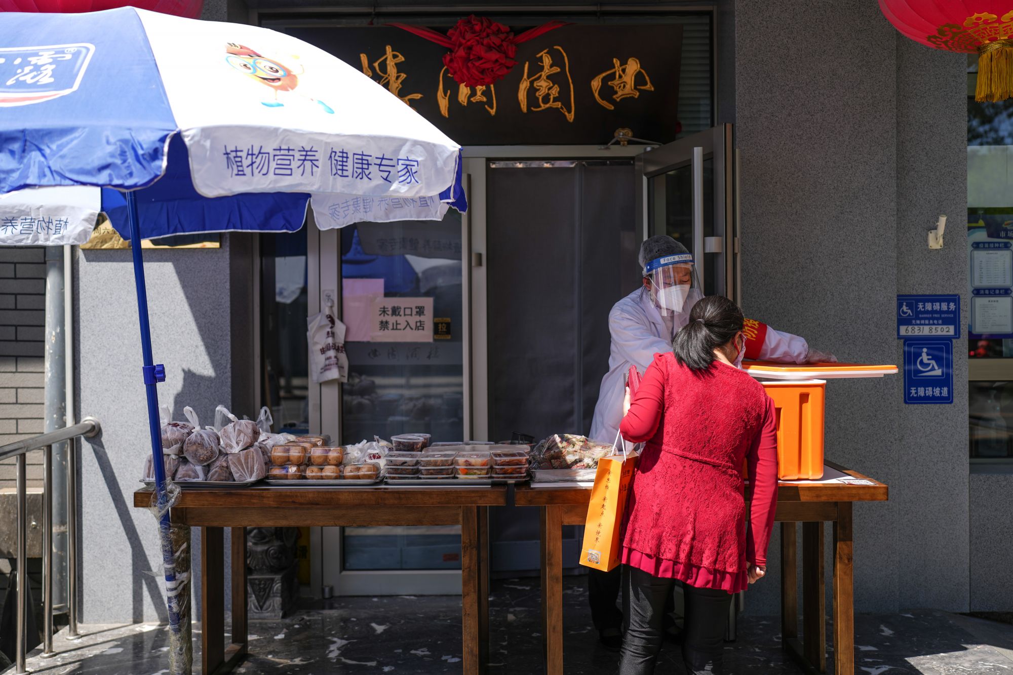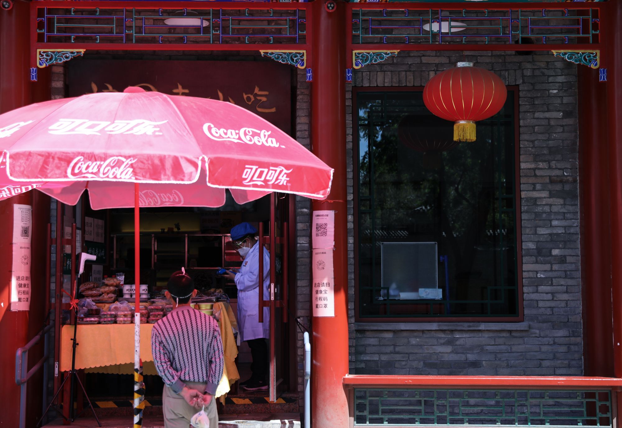 5月14日,在北京西城区,一名男子在一家餐厅购买外带食物。