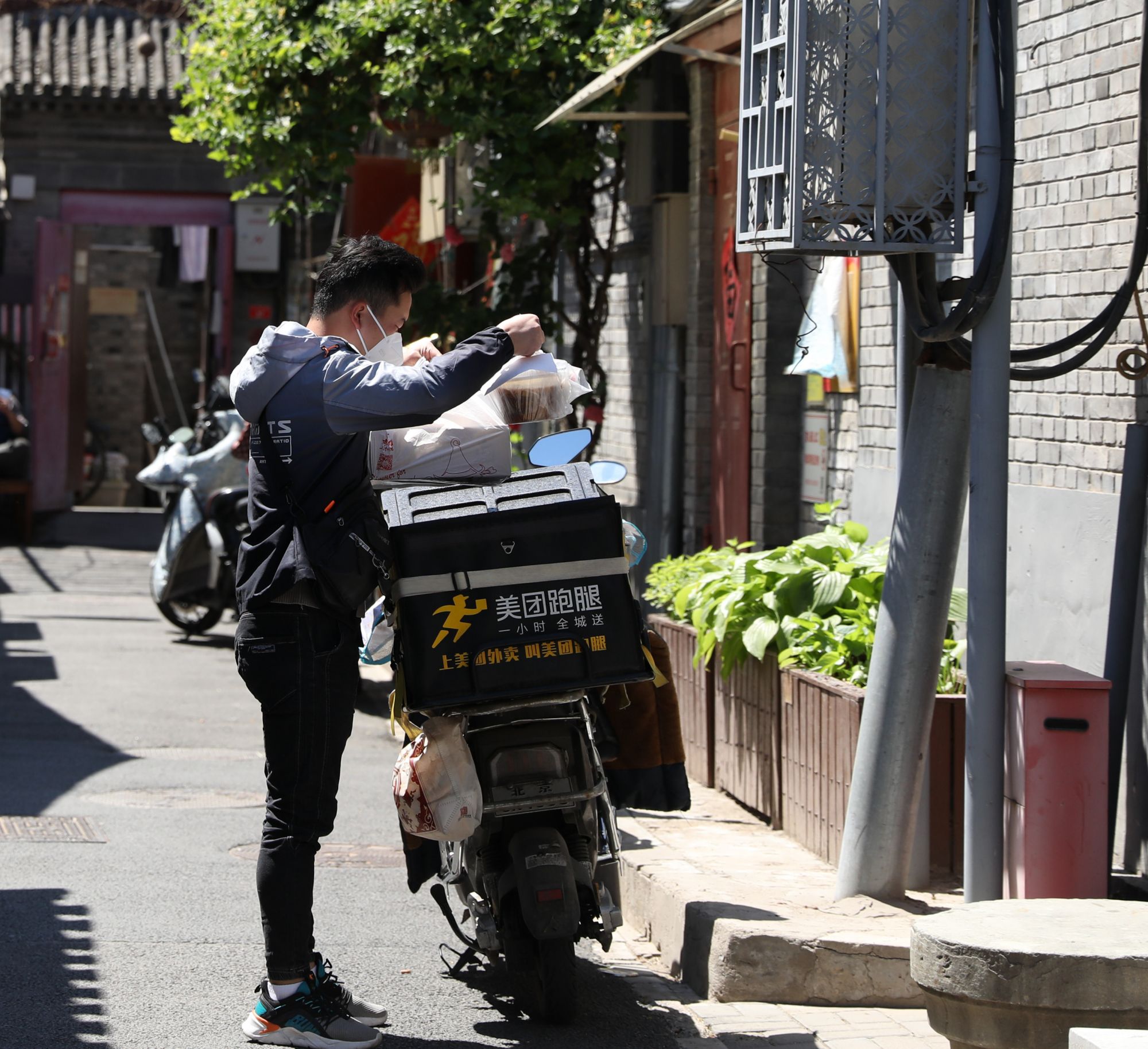 5月14日,在北京西城区义达里,一名外卖员准备配送外卖。