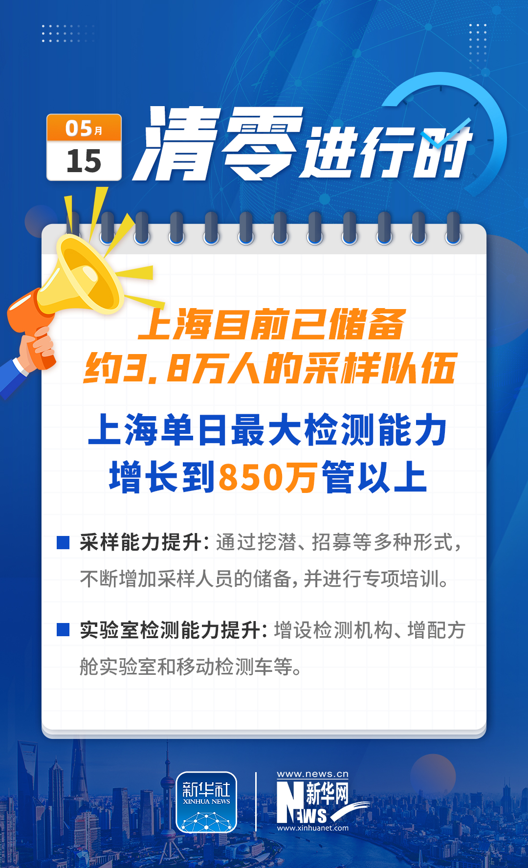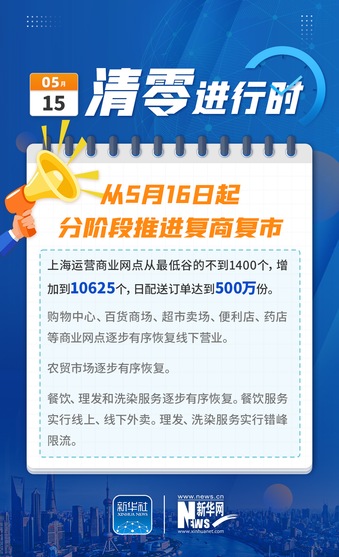记者从15日举行的上海市疫情防控工作新闻发布会上获悉,为做好群众基本生活保障和生活物资供应,上海确定“保基本、全覆盖”工作目标,大力推动网点节点应开尽开、保供人员应返尽返,上海运营商业网点从最低谷的不到1400个,增加到10625个,日配送订单达到500万份。接下来,按照“有序放开、有限流动、有效管控、分类管理”原则,严格落实各项疫情防控措施,从5月16日起,分阶段推进复商复市。此外,上海的核酸检测能力有了明显提升,目前已储备了约3.8万人的采样队伍,并且上海单日最大检测能力增长到850万管以上。