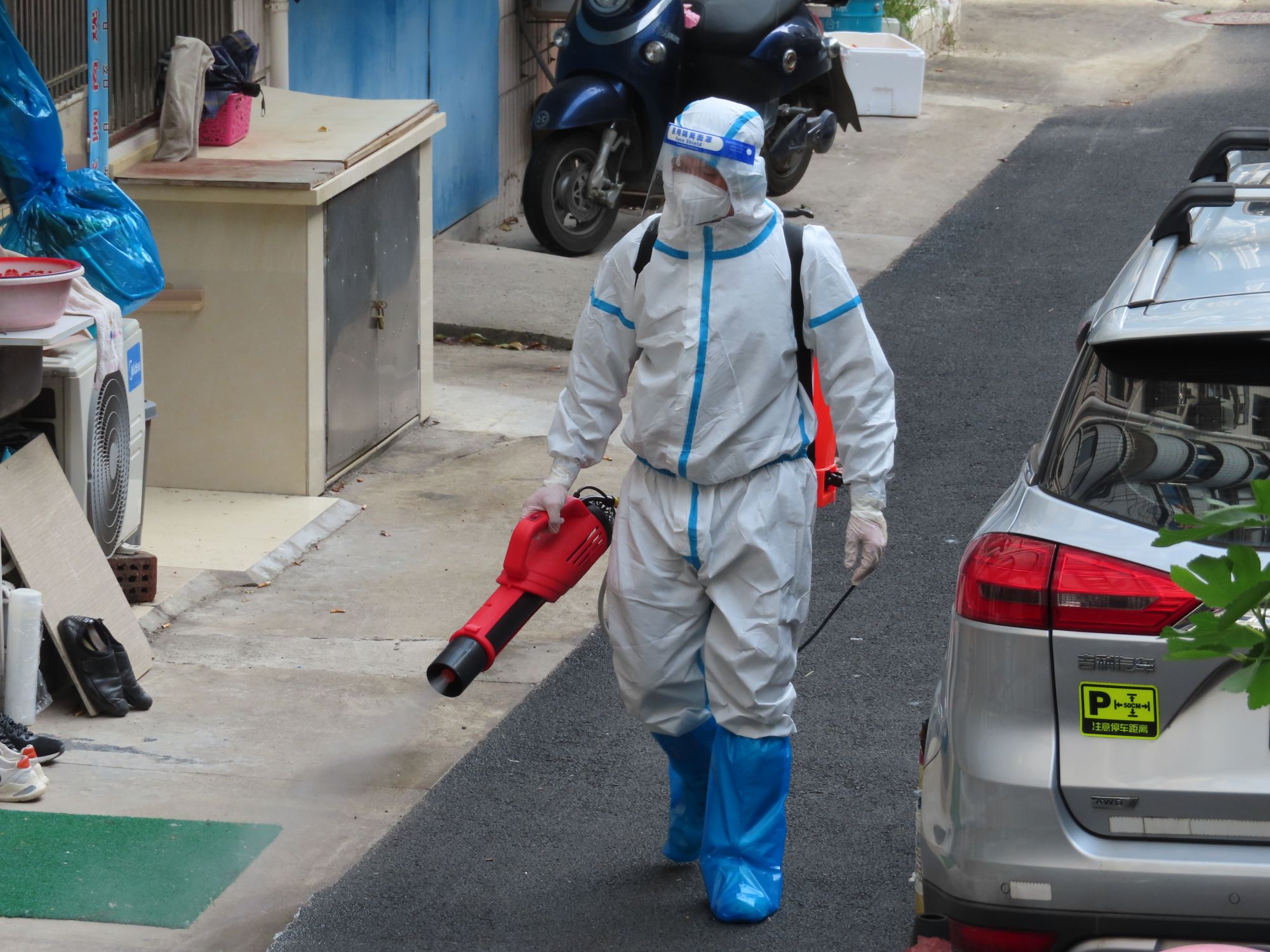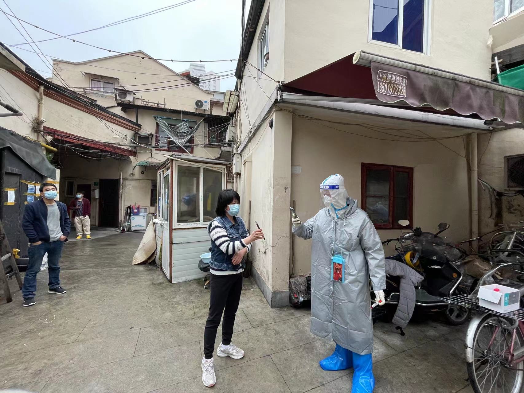 曹艳前往的静安区石门二路街道恒丰居委辖区内多为老旧弄堂,煤卫合用的弄堂环境给防疫带来极大挑战,社区内老年居民居多。每天清早,她身穿“大白”防护服,拉着小推车,搬运桌椅和检测材料从一个弄堂到下一个弄堂,挨家挨户为居民们完成核酸检测。