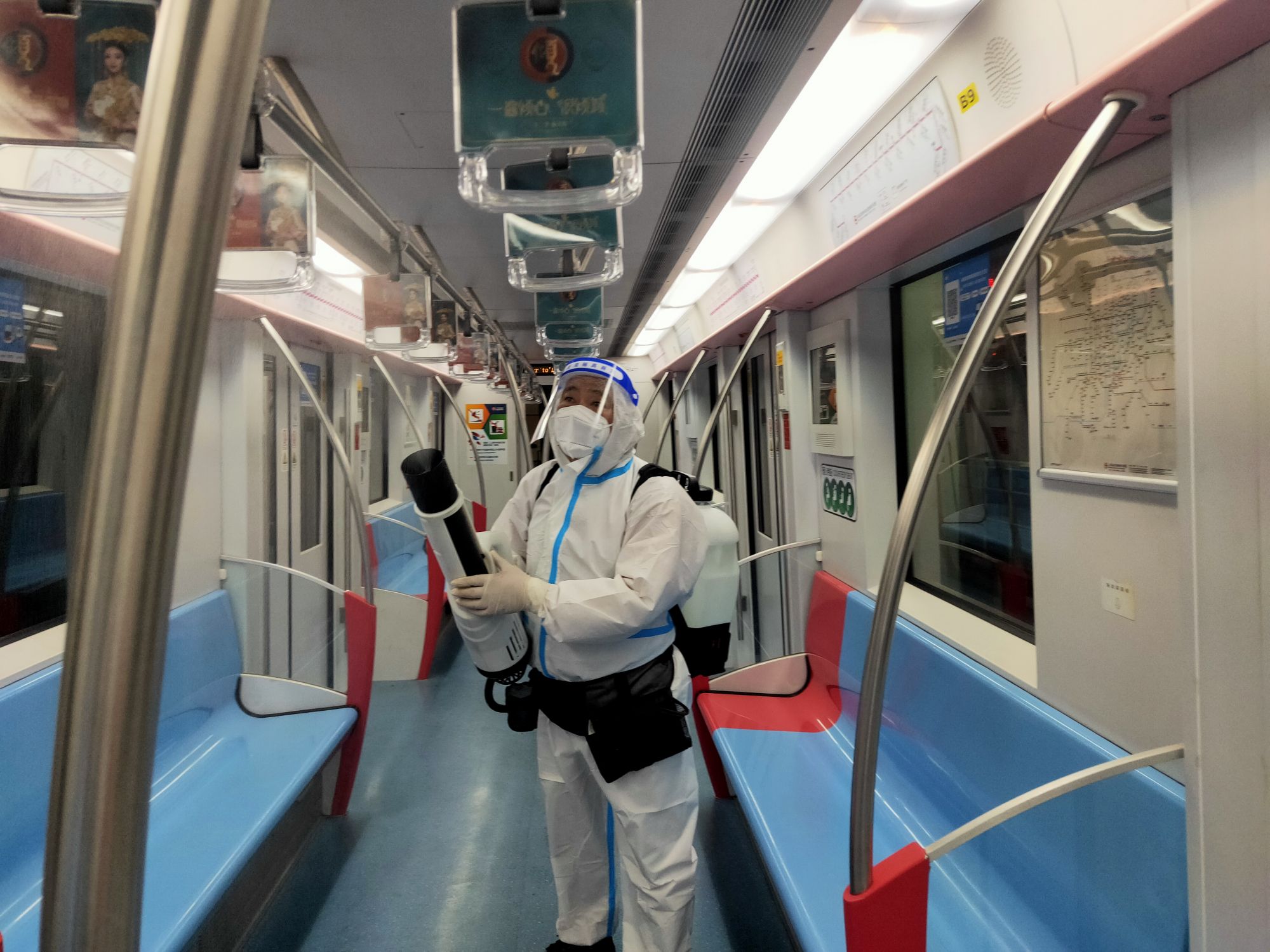 工作人员在对地铁车厢进行清洁消杀 上海地铁供图