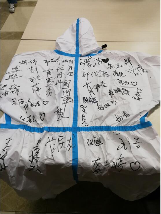 当天,金海园方舱医疗队领队、同济大学附属东方医院泌尿外科主任王海峰召集所有医护人员在一件“大白”防护服上陆续签上姓名。“一个方舱,两地医院,连接井冈、上海两地情谊,我们和来自江西吉安的39名兄弟姐妹们因为疫情聚在了一起,在共同奋斗的一个多月里,我们结下了深厚的友谊!”
