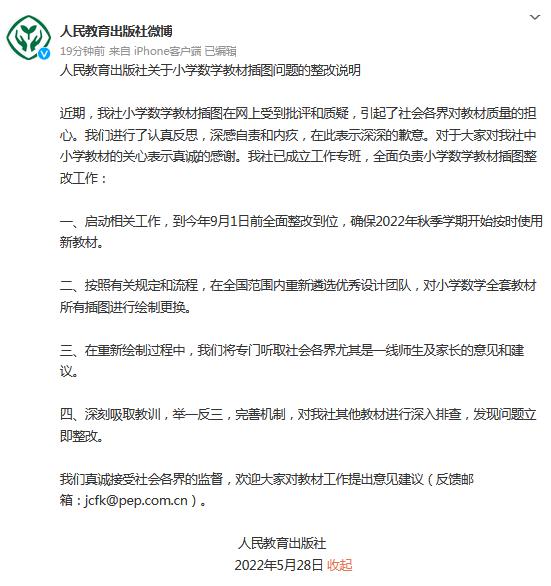四是深刻吸取教训,举一反三,完善机制,对人民教育出版社其他教材进行深入排查,发现问题立即整改。