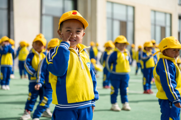 在西藏自治区山南市贡嘎县森布日村,霍党生在幼儿园准备跳课间操(3月22日摄)。新华社记者 周荻潇 摄