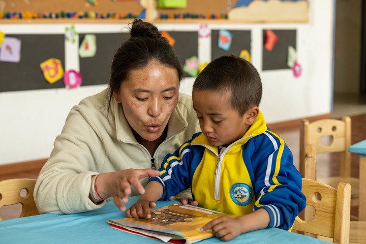 在西藏自治区山南市贡嘎县森布日村,幼儿园老师教霍党生读书(3月22日摄)。新华社记者 周荻潇 摄