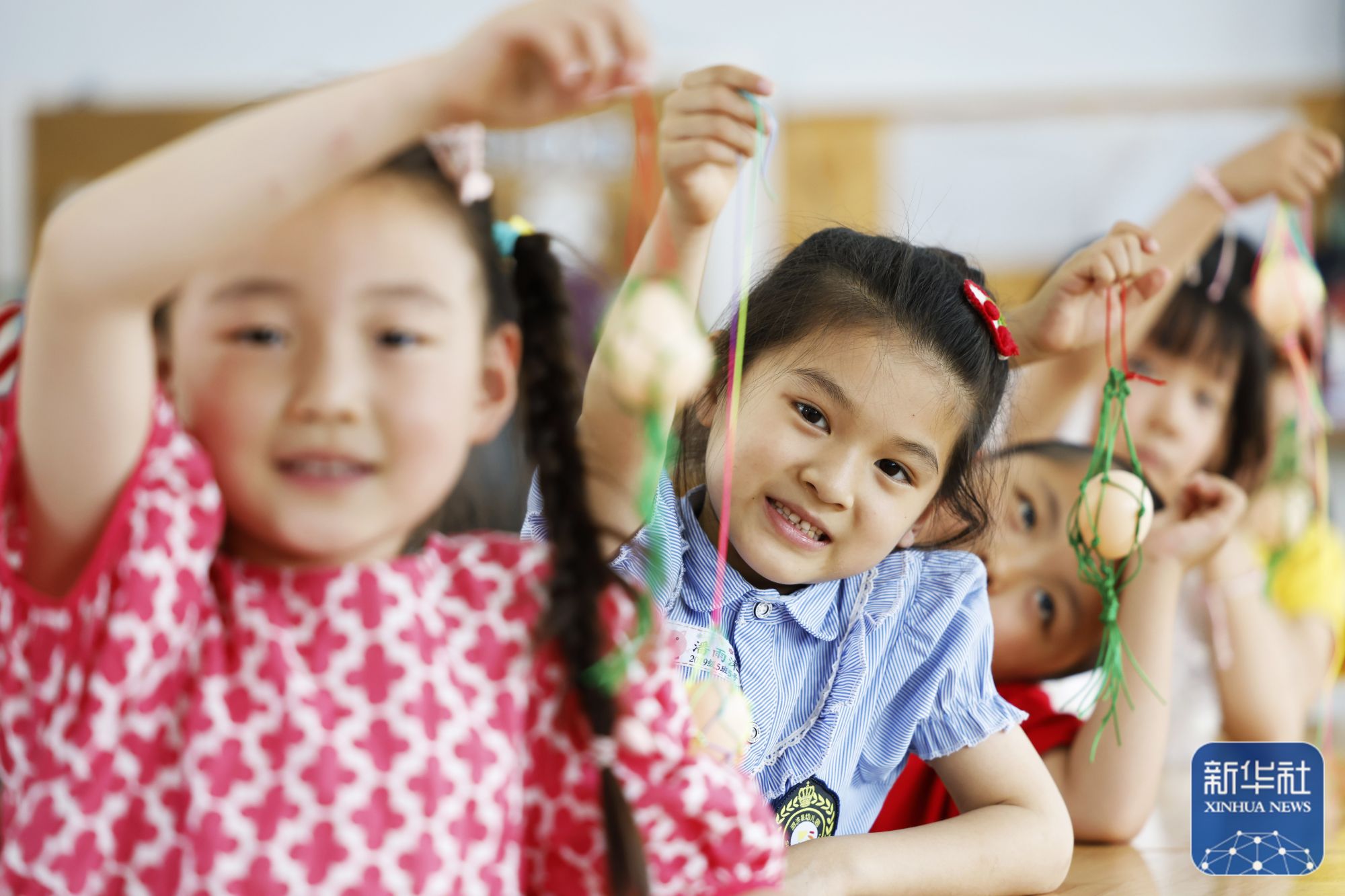 6月2日,在江苏省宿迁市泗洪实验幼儿园,小朋友们展示自己制作的鸡蛋网。新华社发(许昌亮摄)