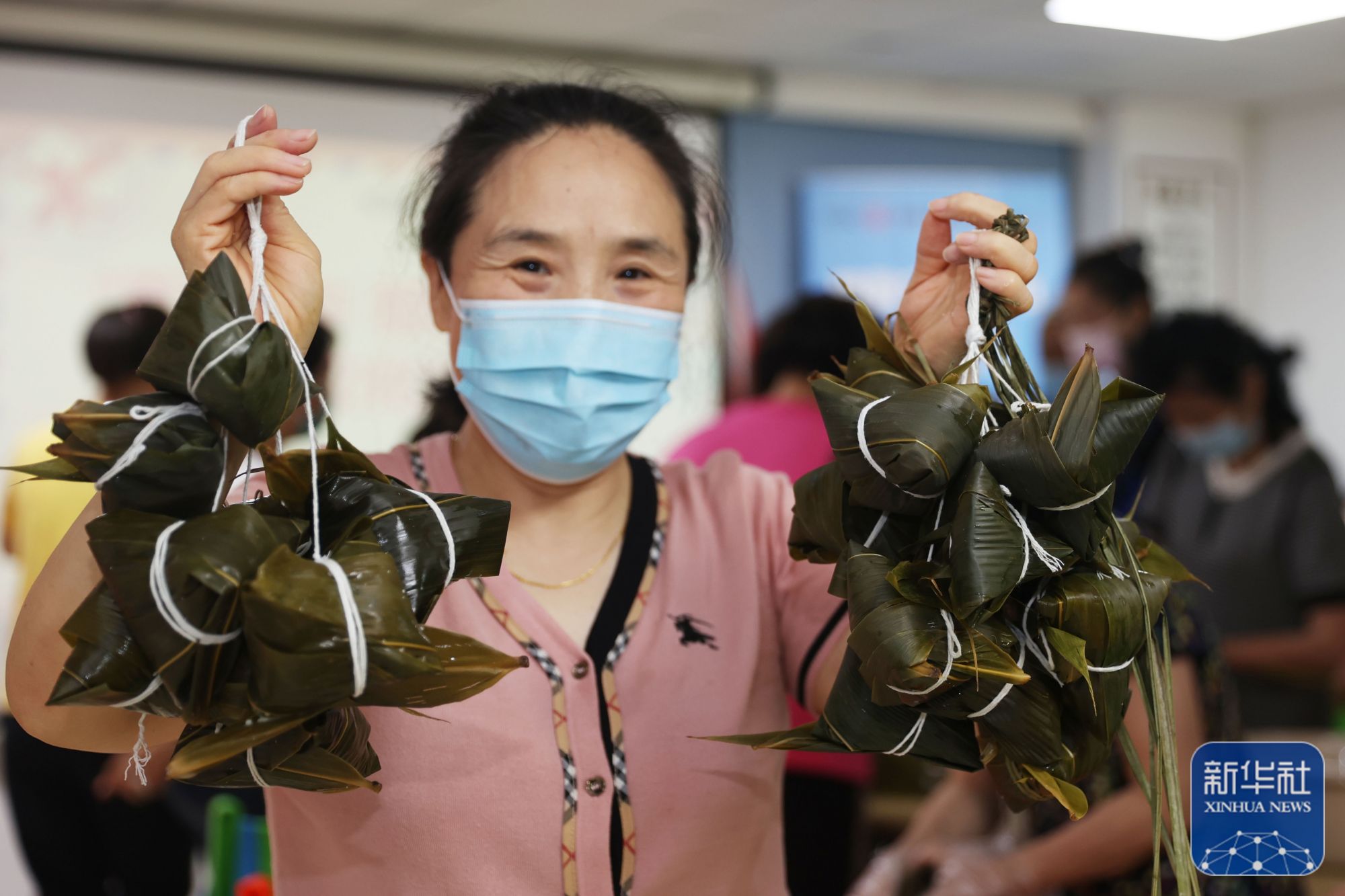 6月2日,厦门市思明区筼筜街道金桥社区居民展示包好的粽子。新华社发(曾德猛摄)