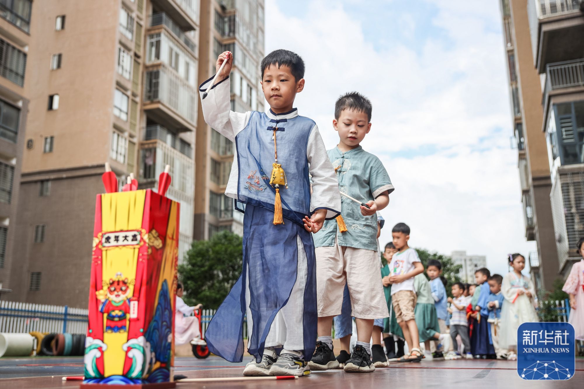 6月2日,四川省南充市蓬安县城东幼儿园的孩子们在玩“投壶”游戏。新华社发(刘永红摄)