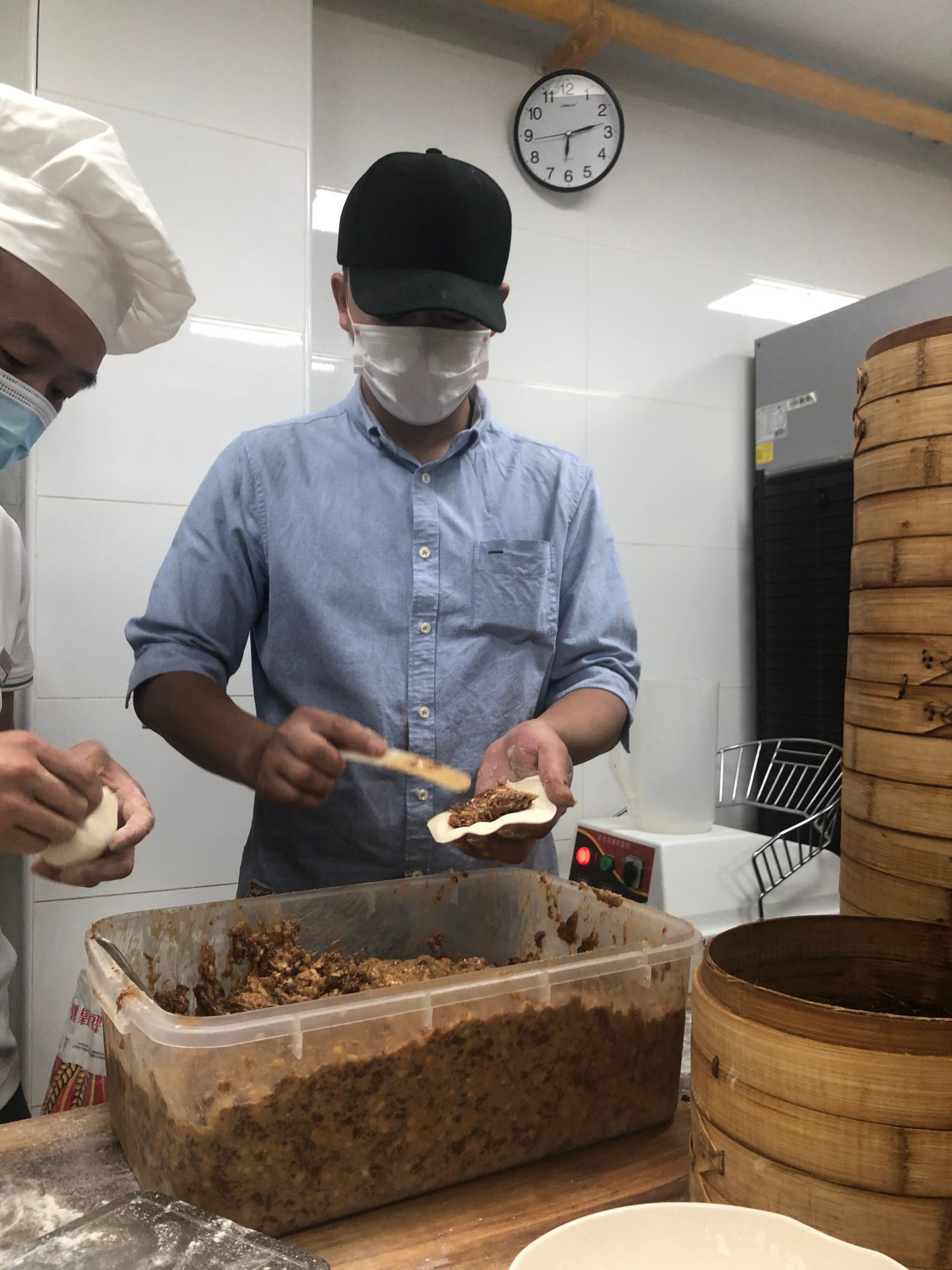 凌晨5点,店里已经香气扑鼻了。厨师大姐醒好了面,此时正在和馅儿,8斤一盆的馅儿料揉起来不是个轻松的活儿,头天恢复堂食,大姐格外卖力。