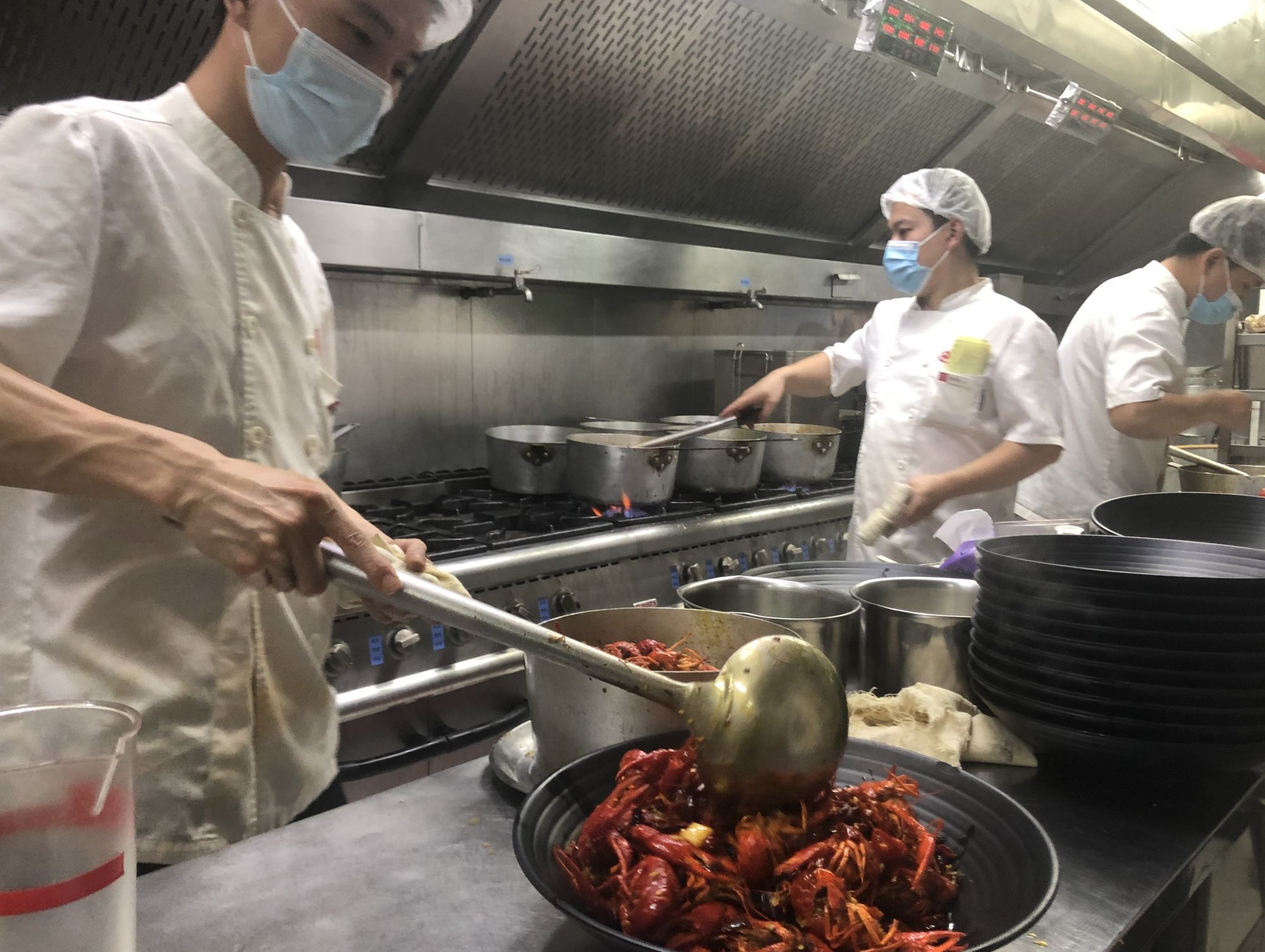 后厨煎炒烹炸之声不绝于耳,炒虾、摆盘,大师傅们戴着网帽、口罩,虽已热得汗流浃背却仍不遗余力。每个人的眼角都挂着笑,他们说从来没有因为上班,心里这么乐过。