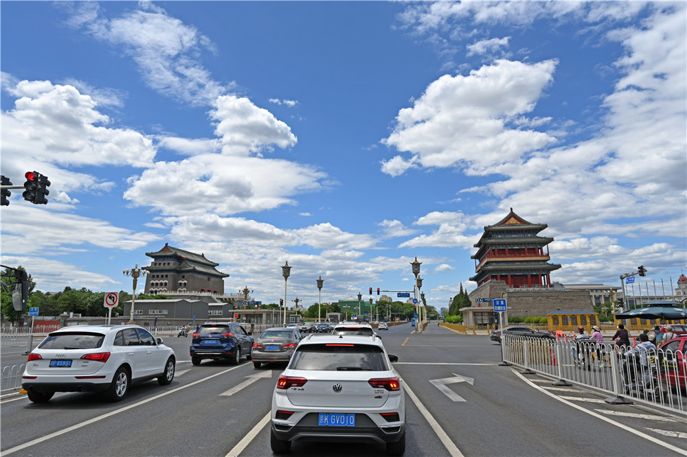 6月6日拍摄的蓝天白云下的北京前门一带。新华社记者 陈晔华 摄