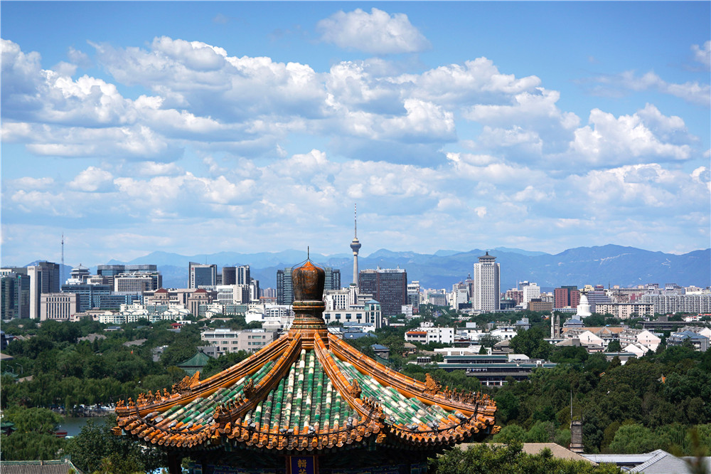 在景山公园拍摄的蓝天白云下的北京城市风光(2020年5月26日摄)。新华社记者 鞠焕宗 摄
