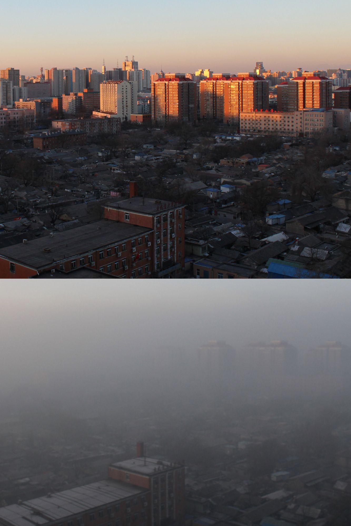 拼版照片:上图为2013年1月9日8时左右拍摄的北京市西城区一片住宅区;下图为2013年1月12日8时左右,同一片住宅区被雾霾笼罩。新华社发(王跃岭摄)