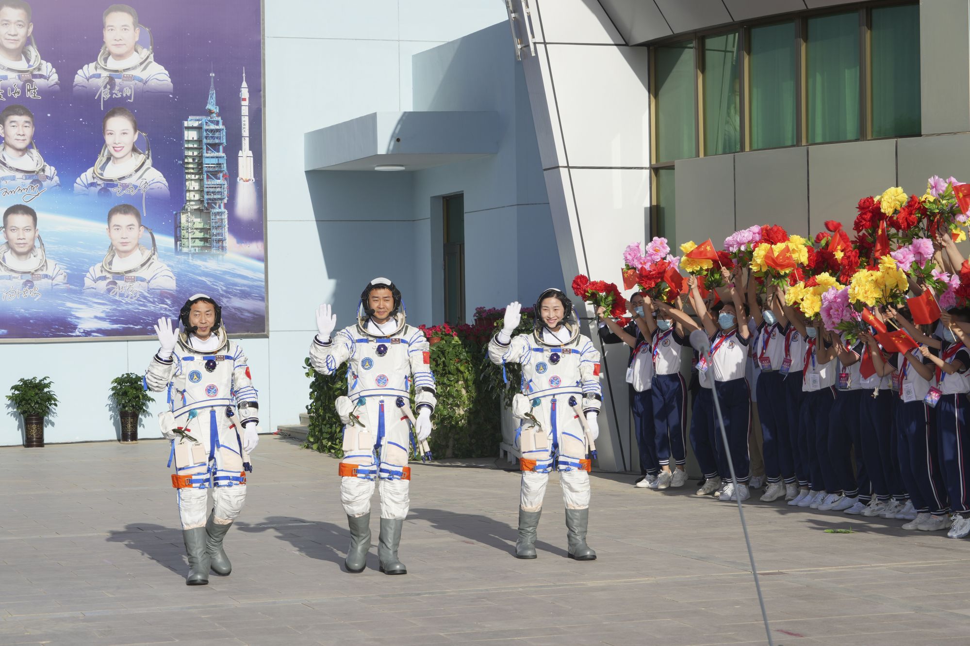 6月5日,神舟十四号载人飞行任务航天员乘组出征仪式在酒泉卫星发射中心问天阁广场举行。陈冬(中)、刘洋(右)、蔡旭哲即将开启为期6个月的飞行任务。新华社记者 李刚 摄