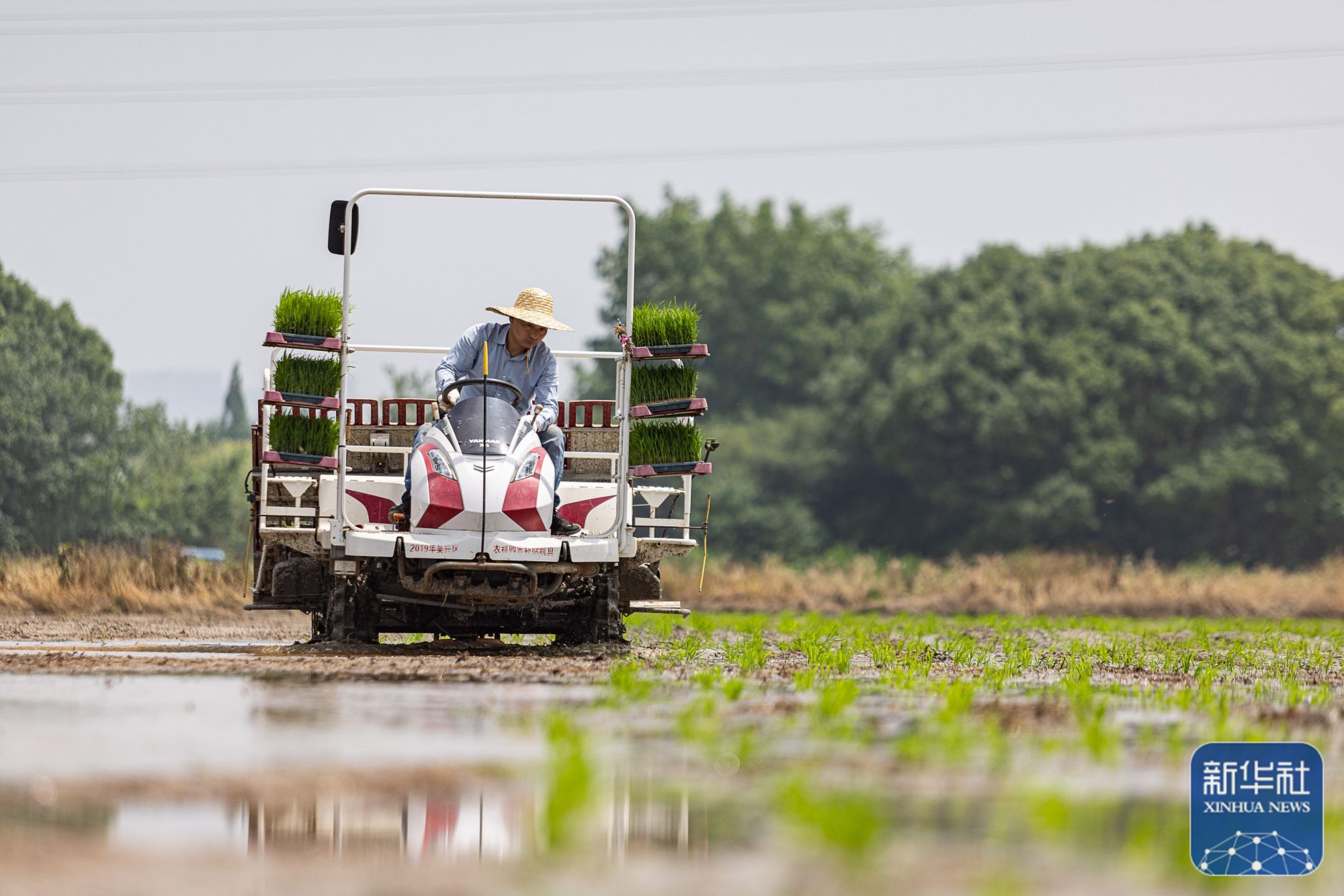 6月7日,在浙江省湖州市八里店镇,村民操作农机在田间插秧。新华社发(伊凡摄)